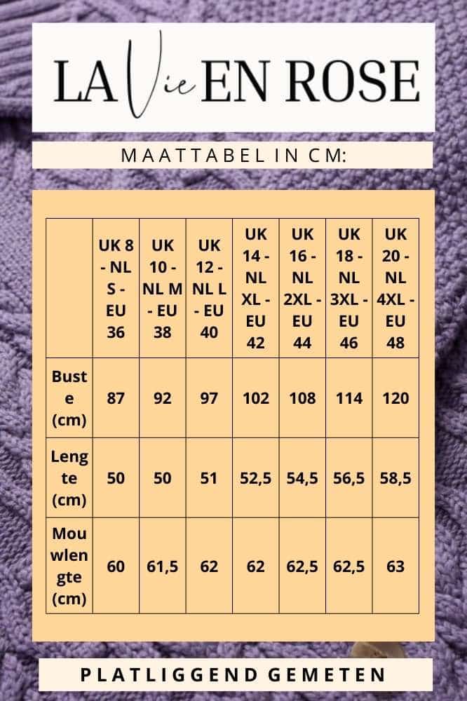 | Maat | UK 8 – NL S – EU 36 | UK 10 – NL M – EU 38 | UK 12 – NL L – EU 40 | UK 14 – NL XL – EU 42 | UK 16 – NL 2XL – EU 44 | UK 18 – NL 3XL – EU 46 | UK 20 – NL 4XL – EU 48 |