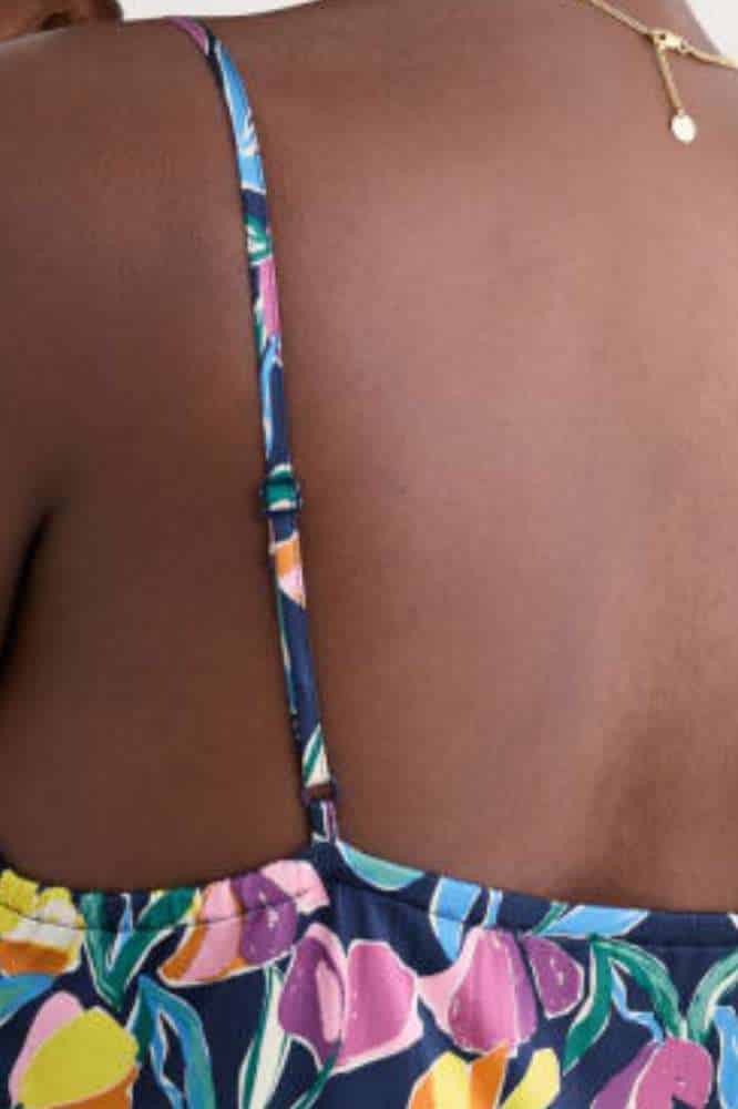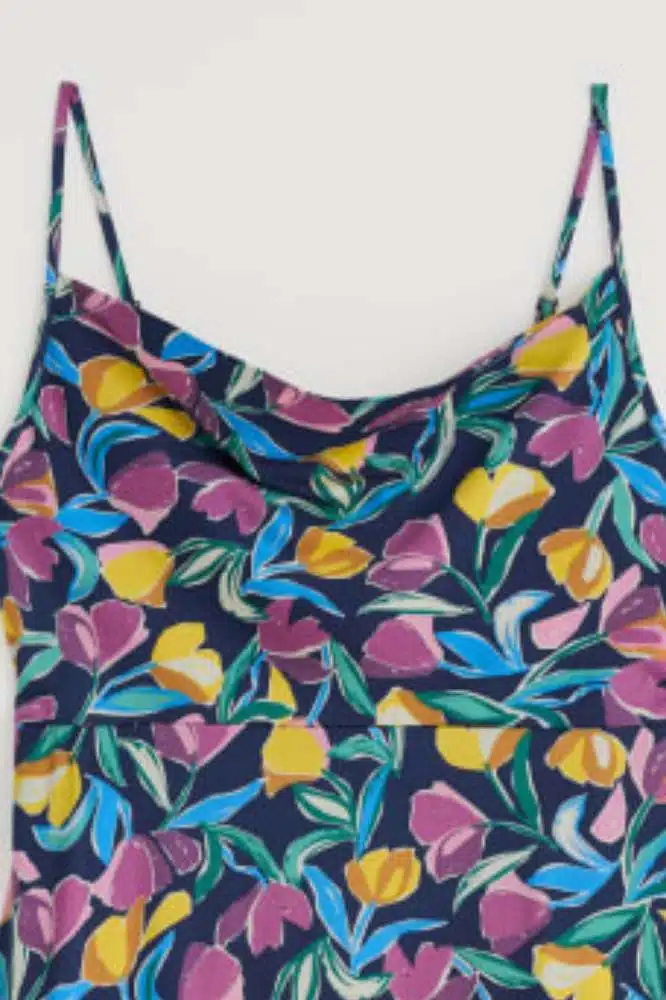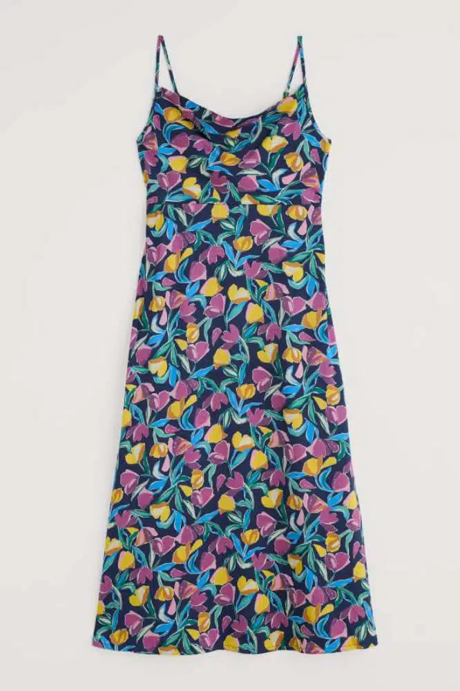 De Collaged Tulips Maritime-print voegt een artistiek en vrouwelijk element toe, geïnspireerd op de natuurlijke schoonheid van Cornwall. De midi-lengte en subtiele A-lijn maken deze jurk perfect voor zowel casual zomerse uitstapjes als feestelijke gelegenheden. Dankzij de verstelbare bandjes en de onzichtbare zijrits biedt de jurk een comfortabele en naadloze pasvorm.