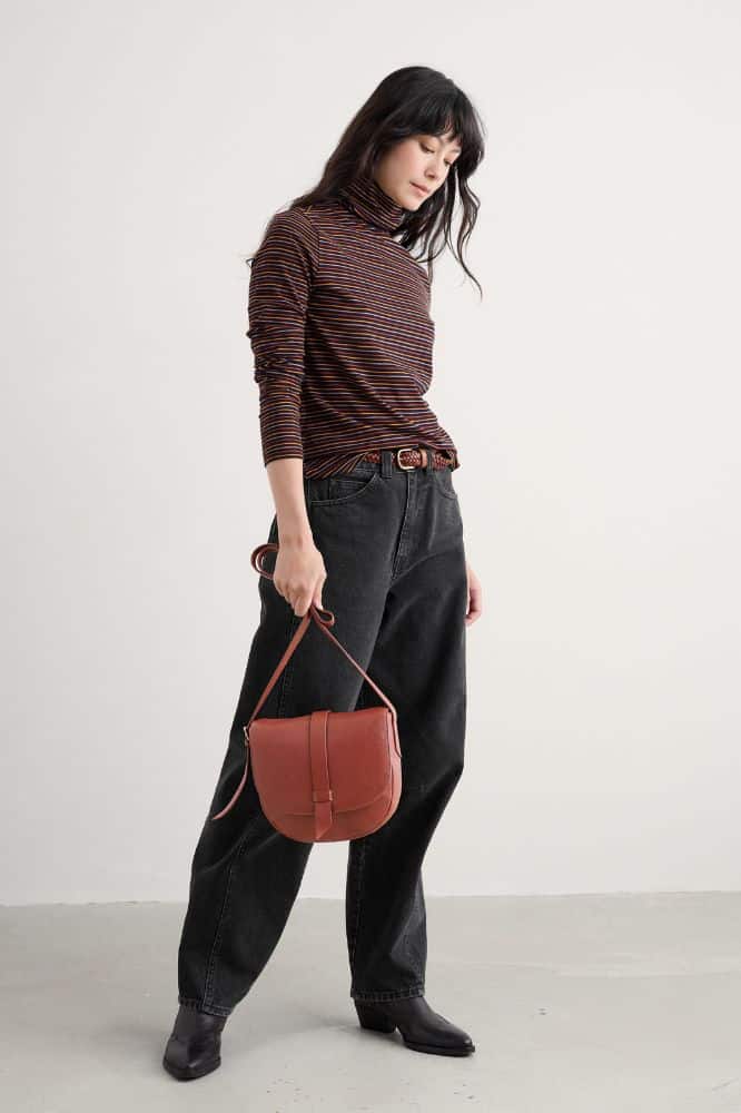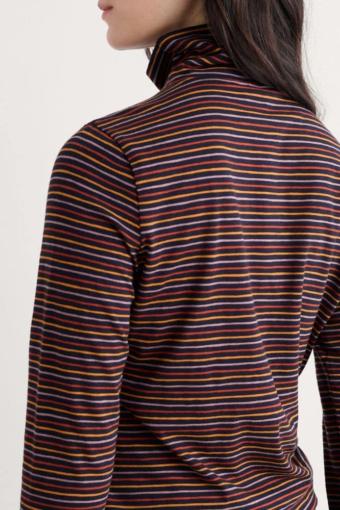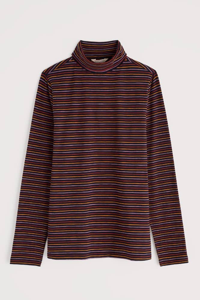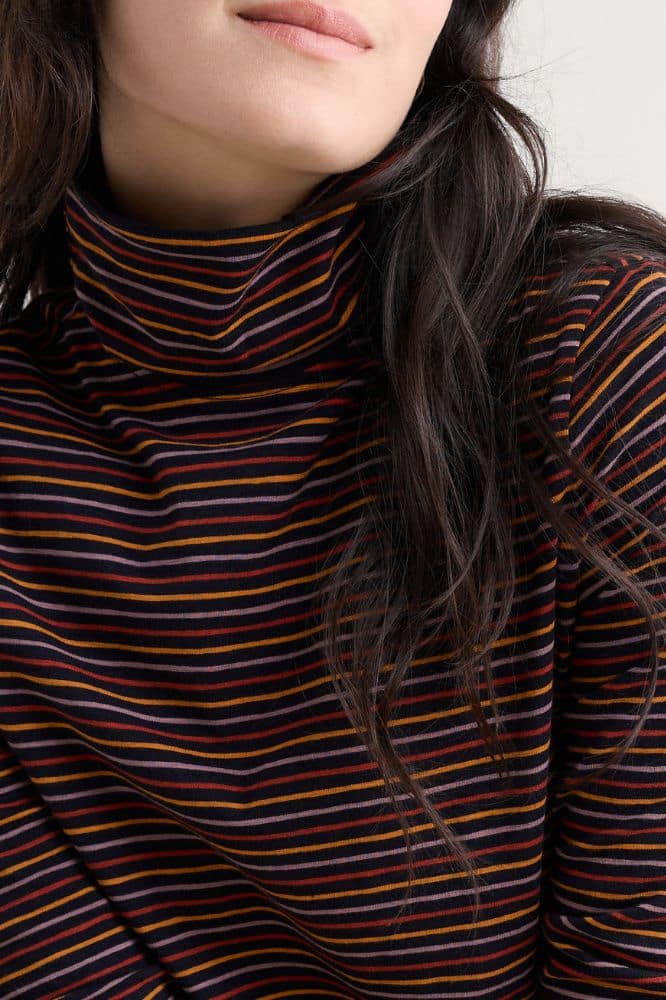 De top is gemaakt van 96% biologische katoen met 4% elastaan, wat zorgt voor zowel comfort als een lichte stretch die mooi in vorm blijft. De stof voelt zacht en ademend aan, waardoor de Landing Top geschikt is voor dagelijks gebruik. Draag hem losjes op een jeans of gestyled onder een jurk of salopette voor een gelaagde look op koelere dagen. De rolkraag geeft extra warmte zonder zwaar te ogen, ideaal voor wisselvallige seizoenen.
