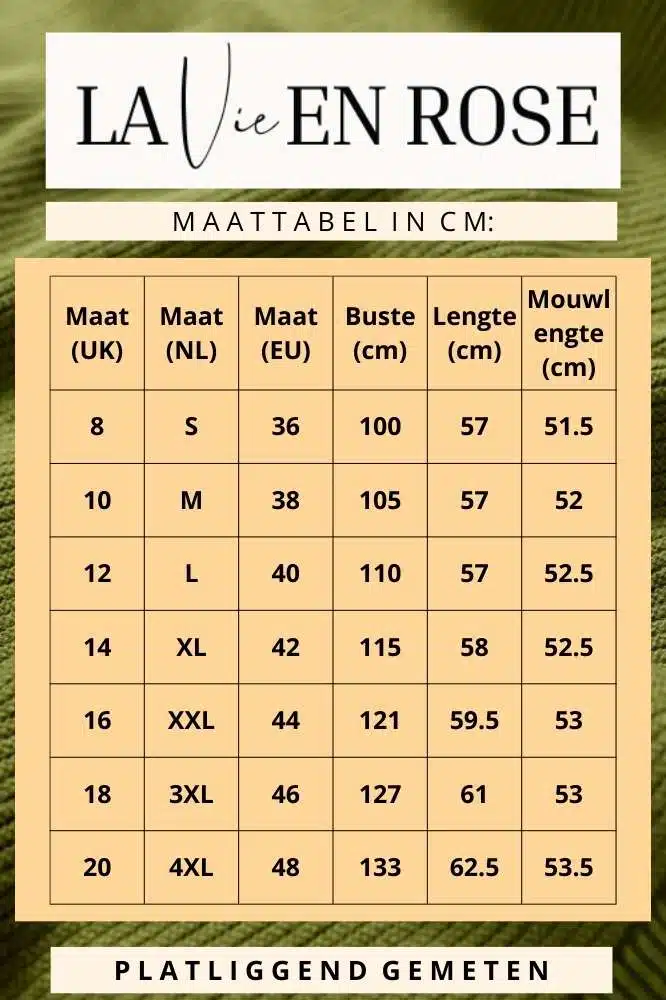 De getoonde afmetingen zijn genomen op het kledingstuk dat plat ligt, waarbij de borst-, heup- en taillematen de omtrek van het kledingstuk zijn. U kunt deze vergelijken met een soortgelijk kledingstuk dat u bezit, zodat u de juiste maat kunt vinden.