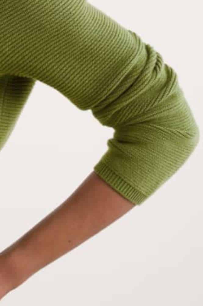 - Details: Textuurgebreid patroon, ribgebreide manchetten en zoom