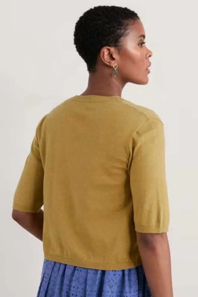 De Maria Cardigan Pear van Seasalt Cornwall is een prachtige toevoeging aan je zomergarderobe. Deze gebreide cardigan is gemaakt van biologisch katoengaren en biedt een lichte warmte en levendige kleuren die perfect passen bij de prints en strepen van dit seizoen. Het eenvoudige, maar stijlvolle ontwerp maakt het een veelzijdig kledingstuk dat zowel casual als formeel gedragen kan worden.