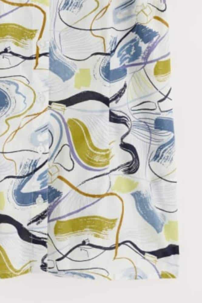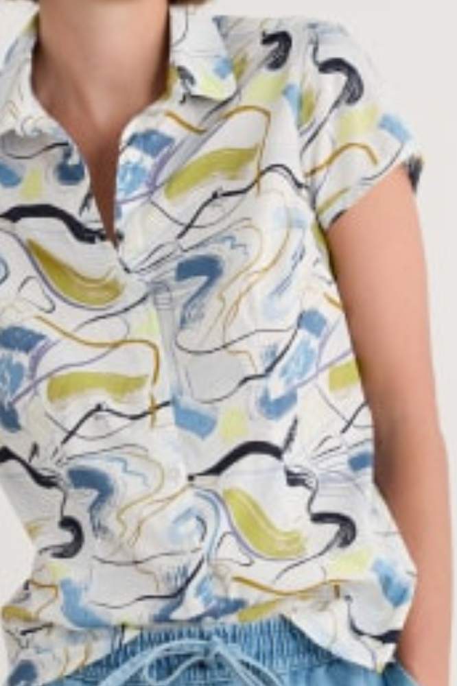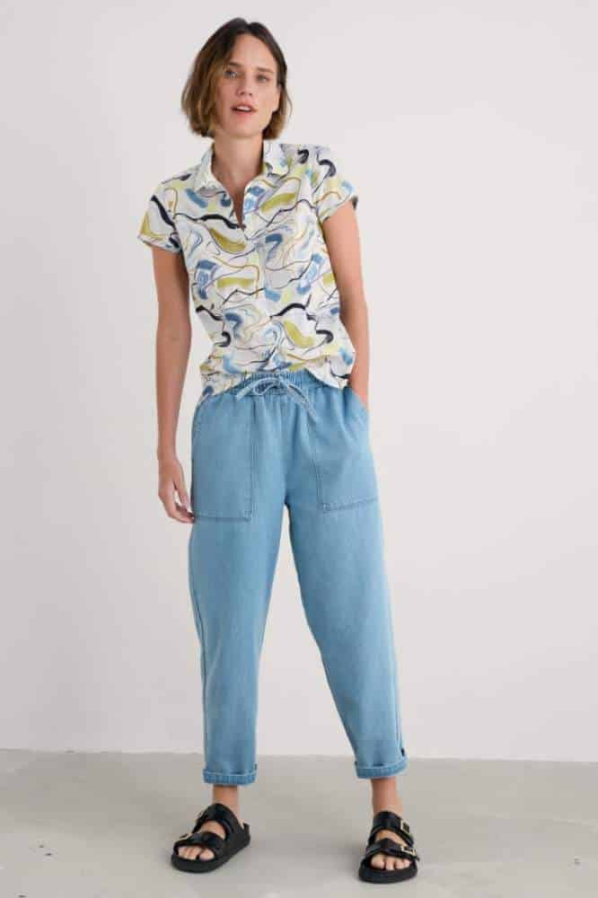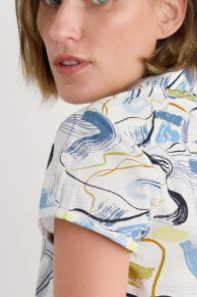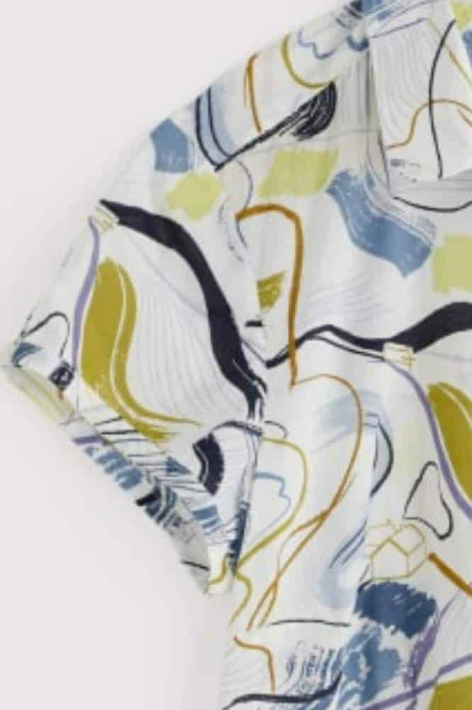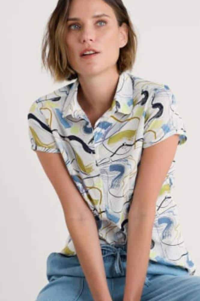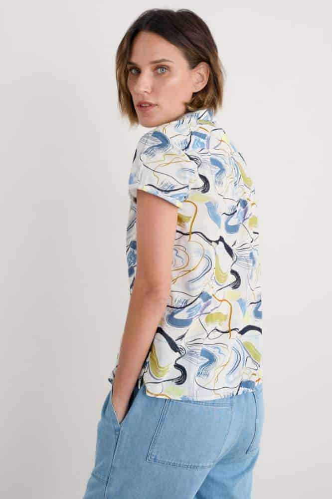 Deze blouse combineert moeiteloos met een cropped broek, losvallende linnen pantalons of een rok. Draag haar met platte leren sandalen en een rieten tas voor een luchtige, zomerse stijl. Door de ingetogen kleuren in krijtwit, zachtblauw en grijsgroen is de print makkelijk te combineren en toch onderscheidend. De Rushmaker Shirt is perfect voor alledaags gebruik, vakantie of een informeel dagje uit.