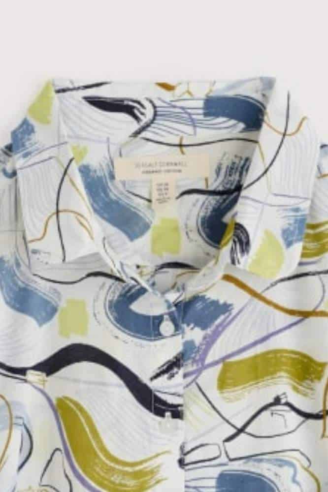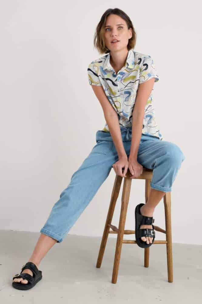 De Rushmaker Shirt Porthmeor Sketch Chalk is een zomers damesoverhemd met een speelse en toch verfijnde uitstraling. Deze blouse is ontworpen in Cornwall en draagt de kenmerkende Seasalt-handtekening: een artistieke print geïnspireerd op de kust, natuur en cultuur van Zuidwest-Engeland. De half-getailleerde pasvorm zorgt voor een subtiel vrouwelijke look, terwijl de luchtige 100% biologische katoen voile het ultieme zomergevoel oproept. De zachte stof beweegt moeiteloos met je mee en voelt koel en licht aan op warme dagen. De ronde kraag, kapmouwtjes en kleine keyhole-details geven de blouse een charmante uitstraling. De knoopsluiting maakt het eenvoudig om de blouse op meerdere manieren te dragen: open over een top, volledig dicht of deels losjes voor een nonchalante twist.