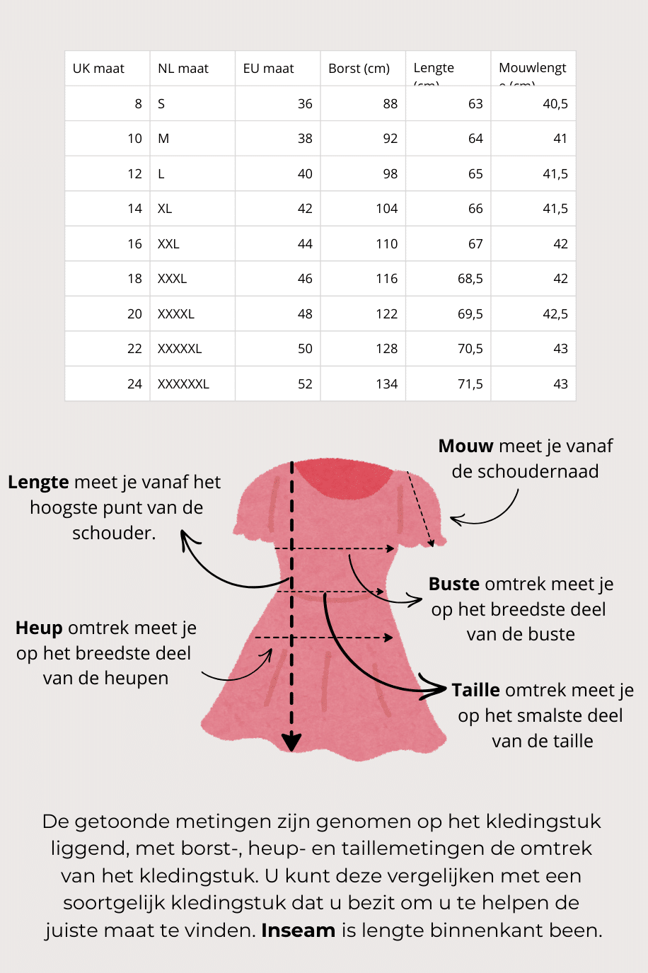 De maten zijn gemeten terwijl het kledingstuk plat ligt. Borstmaten geven de omtrek van het kledingstuk weer.