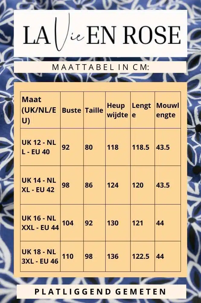 De maten zijn genomen terwijl het kledingstuk plat ligt. De buste-, taille- en heupomtrek zijn de volledige omtrek van het kledingstuk. Vergelijk deze met een soortgelijk item in je kast voor de juiste pasvorm.