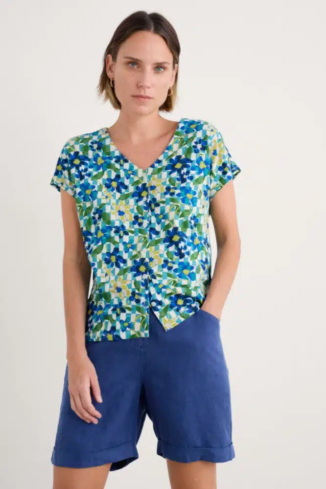 De Studio Glass Top in de kleur Picnic Floral Chalk van Seasalt Cornwall is een luchtige en vrouwelijke blouse die moeiteloos stijl en comfort combineert. Met een ontspannen pasvorm en een charmante V-hals is deze top ideaal voor warme dagen en zomerse uitstapjes. De delicate bloemenprint in zachte tinten geeft een frisse uitstraling die gemakkelijk te combineren is met zowel casual als meer geklede outfits.