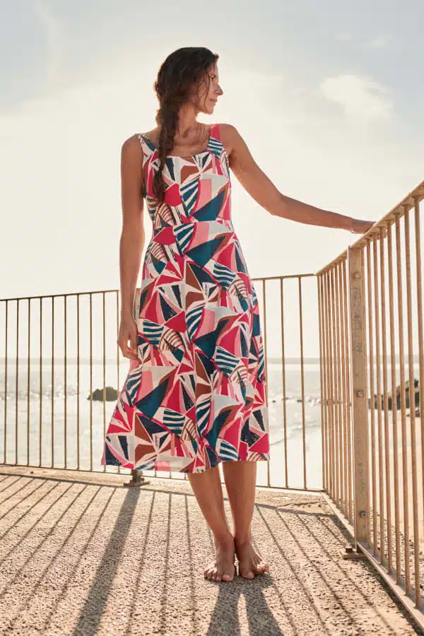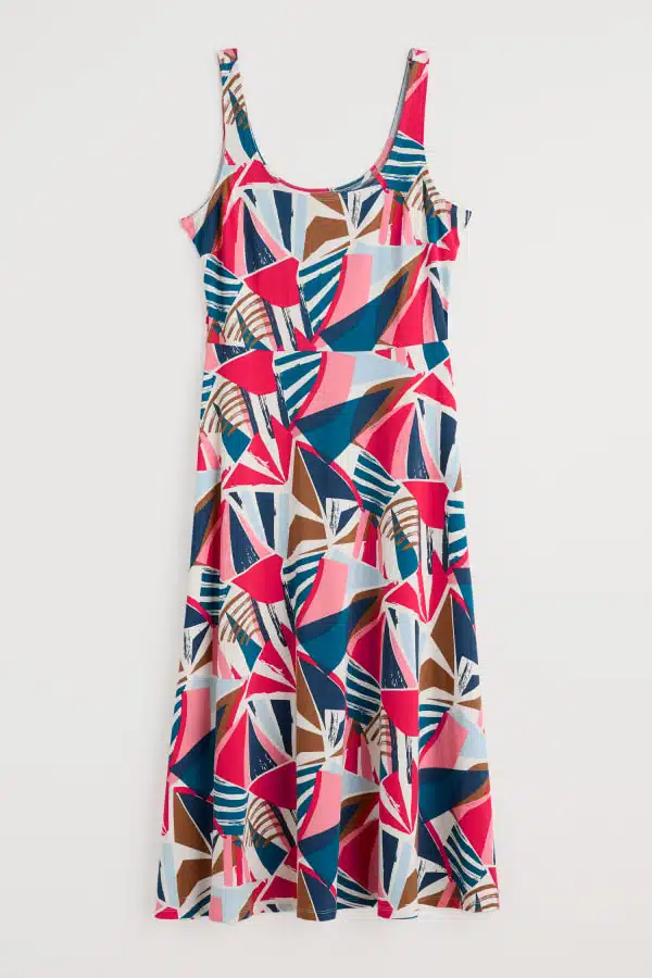 Het rond uitgesneden decolleté zorgt voor een elegante uitstraling, terwijl het zomerse Spinnaker Sails Chalk-patroon subtiel maritiem aanvoelt. Deze jurk laat zich makkelijk combineren met minimalistische sandaaltjes en een zonnehoed voor een relaxte zomerdag, maar is ook heel geschikt om op te stijlen met opvallende sieraden voor een zomers diner of feestje.