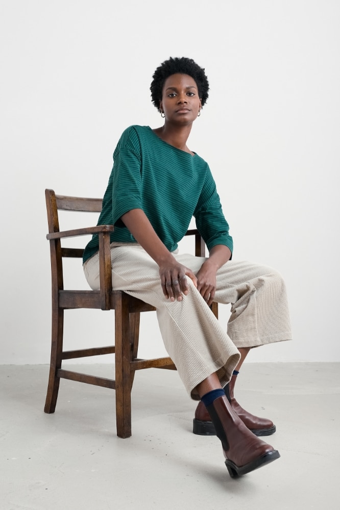 Het model is gemaakt van 100% GOTS-gecertificeerd biologisch katoen: zacht, ademend en stevig genoeg om mooi in vorm te blijven. De boothals geeft een frisse, vrouwelijke lijn, terwijl de verlaagde halflange mouwen zorgen voor dat nonchalante, moderne silhouet waar Seasalt zo goed in is. De licht afgeronde zoom maakt ‘m extra flatterend — ook als je ‘m half in een broek stopt.
