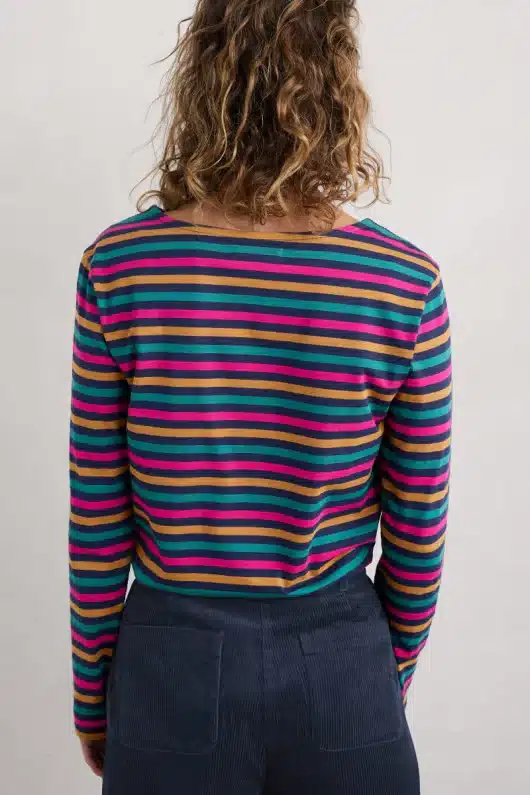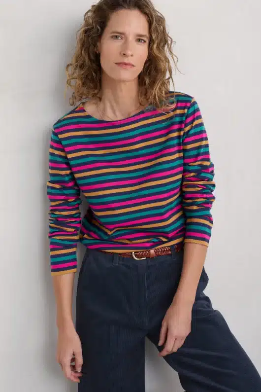 Ontdek moeiteloze stijl met onze Tri Mini Cornish Maritime Coulis Sailor Shirt van Seasalt Cornwall. Gemaakt van zachte en ademende biologische katoenen jersey, biedt dit shirt met lange mouwen en een elegante boothals een tijdloze uitstraling. De door Breton geïnspireerde strepen zijn geverfd met kleurvaste garens voor een heldere kleur en langdurige frisheid. Ontdek maandelijks nieuwe kleuren geïnspireerd op het prachtige Cornwall.