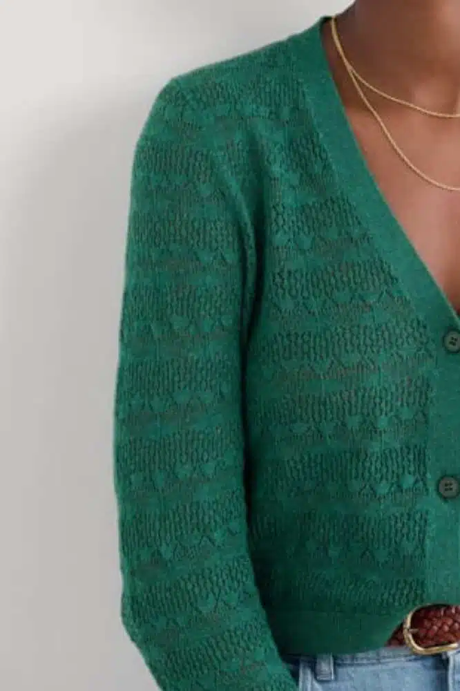 De semi-getailleerde pasvorm zorgt ervoor dat de cardigan mooi aansluit zonder strak te zitten. De lengte tot op de heup maakt het een veelzijdig kledingstuk dat je moeiteloos combineert met een tea dress of een casual jeans met een T-shirt. De diepe V-hals geeft het vest een vrouwelijke uitstraling en maakt het eenvoudig te dragen over verschillende tops.