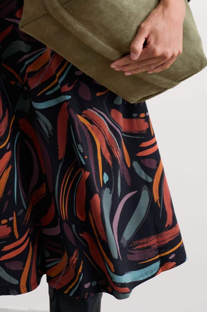 De Dune Marks Onyx-print is een ingetogen mix van diepe tinten en natuurlijke contrasten die moeiteloos combineert met vesten, jasjes of een sjaal. Dankzij de stretch in de stof beweegt de jurk soepel met je mee, zonder te kreuken. Een stijlvolle én praktische keuze die niet in je kast blijft hangen.