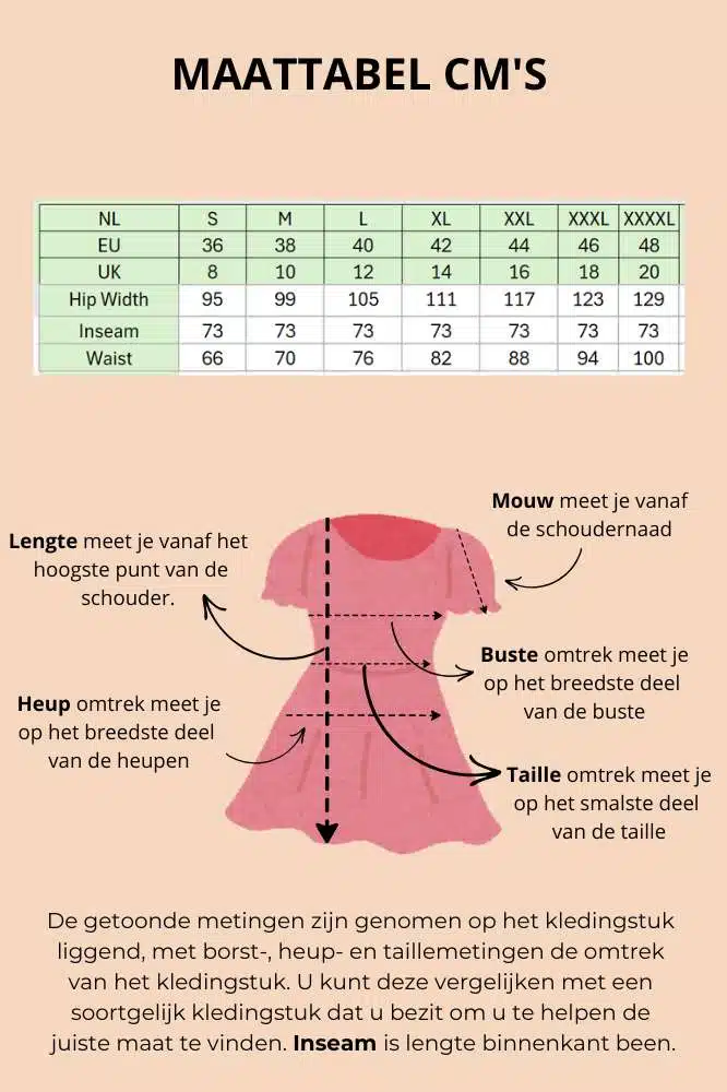 • Model draagt: maat 10, lengte ca. 1,75 m