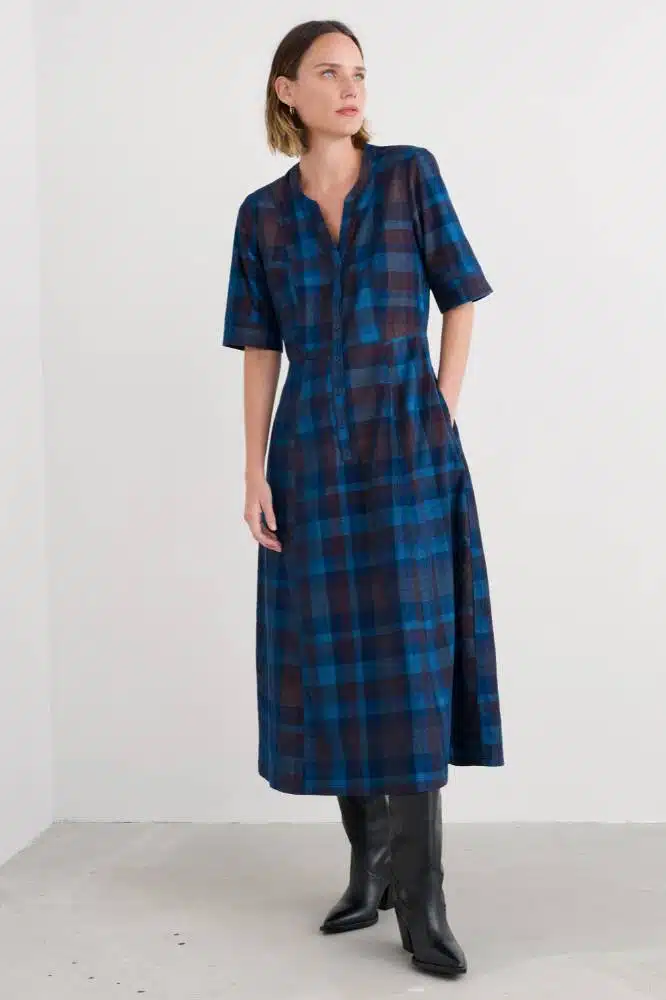 De jurk bestaat uit biologisch katoen en een voering van gerecycled polyester. Biologisch katoen wordt geteeld zonder schadelijke pesticiden, wat beter is voor mens en milieu, terwijl gerecycled polyester bestaande grondstoffen een tweede leven geeft. Dit maakt de Wightwick Dress een verantwoorde keuze die stijl en duurzaamheid combineert, zonder concessies te doen aan kwaliteit of draagcomfort.