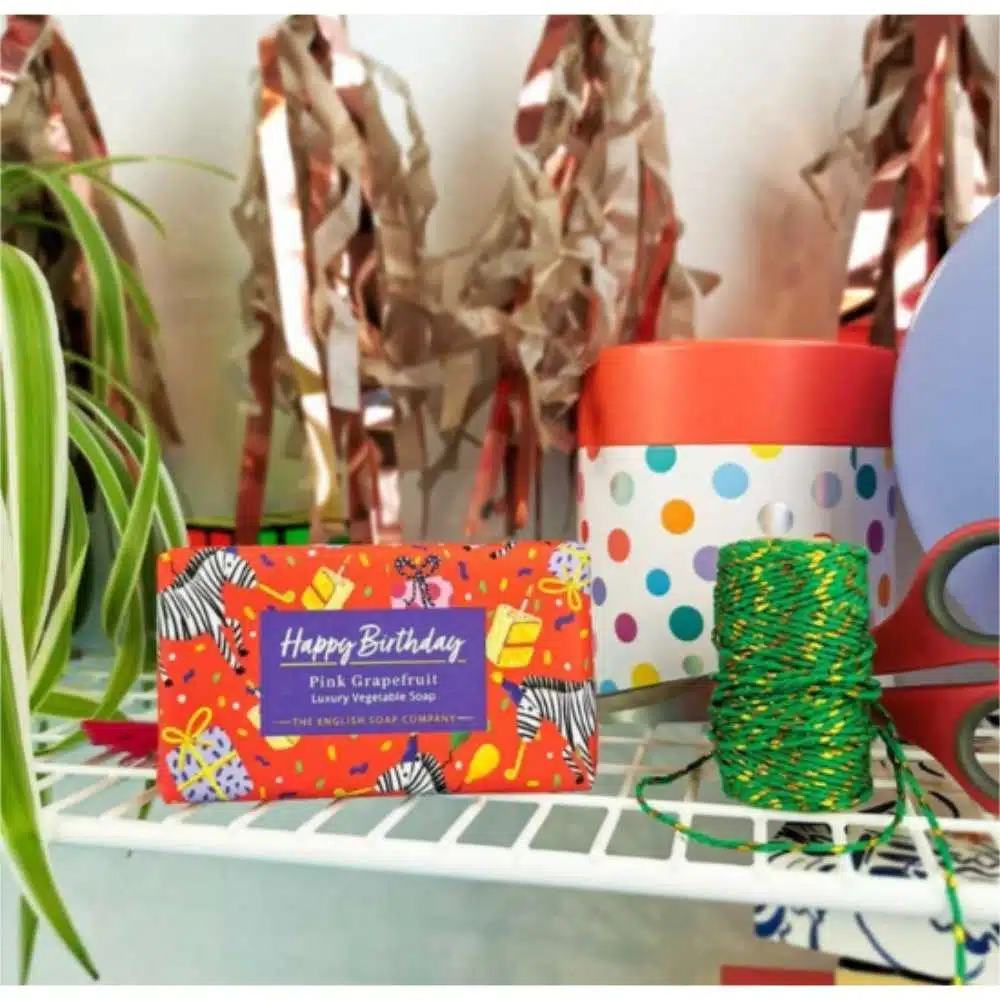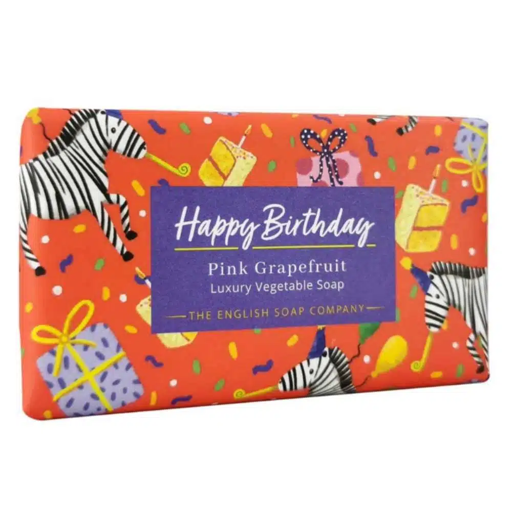 Een naar lavendel geurende zeep verpakt in een met de hand geïllustreerde papieren verpakking met een speciale ‘Happy Birthday’-boodschap. Deze English Lavender Happy Birthday Soap is een ideaal cadeau en een attente manier om iemand een hele fijne verjaardag te wensen.