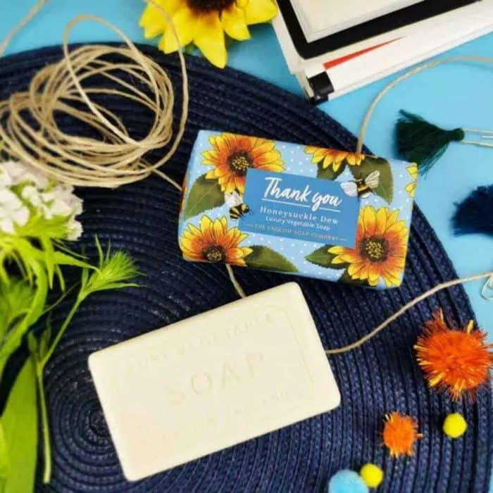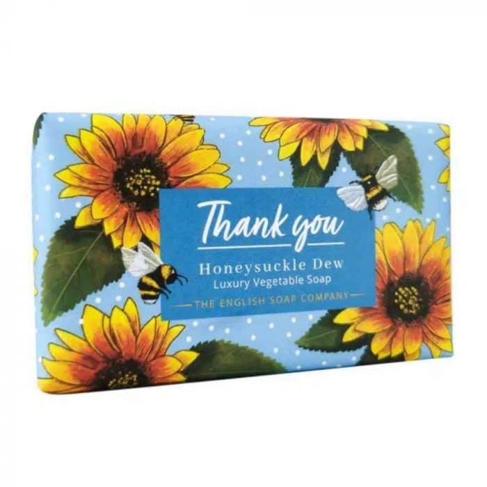 De Honeysuckle Dew Thank You Soap is geparfumeerd met zoete tonen van kamperfoelie en waterlelie, met uitbarstingen van citrus en oranjebloesem. Prachtige bijen zoemen over met de hand geïllustreerde zonnebloemen op de prachtige papieren verpakking.