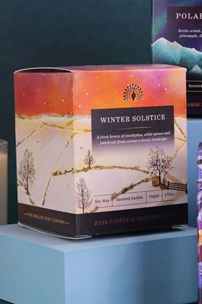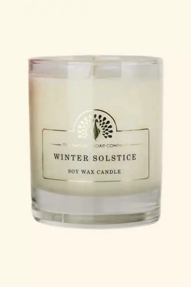 Laat je ruimte vullen met de winterse geur van de Winter Solstice Soy Candle van The English Soap Company. Deze handgegoten kaars in een herbruikbare glazen pot straalt luxe en duurzaamheid uit. De natuurlijke sojawas brandt schoon en gelijkmatig, terwijl de 100% katoenen lont zorgt voor een langdurige, stabiele vlam. De geur van witte spar, eucalyptus en een vleugje limoen geeft een verfrissende winterse vibe. Diepe hartnoten van dennen en basisnoten van amber, kaneel, mos en patchouli maken de geur helemaal af en brengen je in gedachten naar een serene winterlandschap.