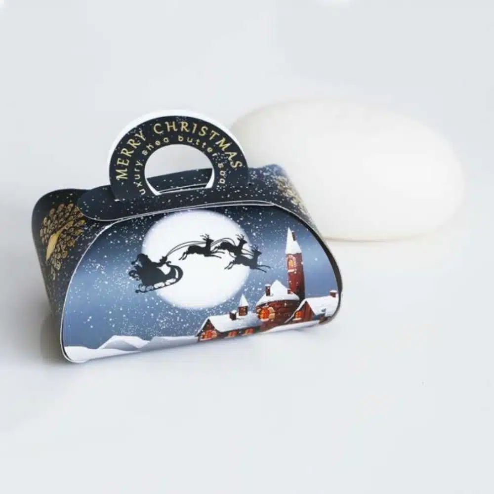 Kerstzepen, uit de Kerstzeepcollectie. Verpakt in prachtig ontworpen feestelijk papier, is deze luxe zeep verrijkt met sheaboter om een voedend en hydraterend schuim te creëren, geschikt voor alle huidtypes.