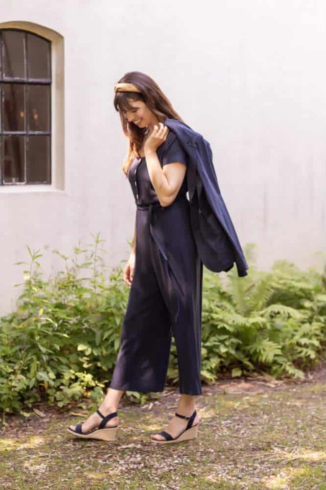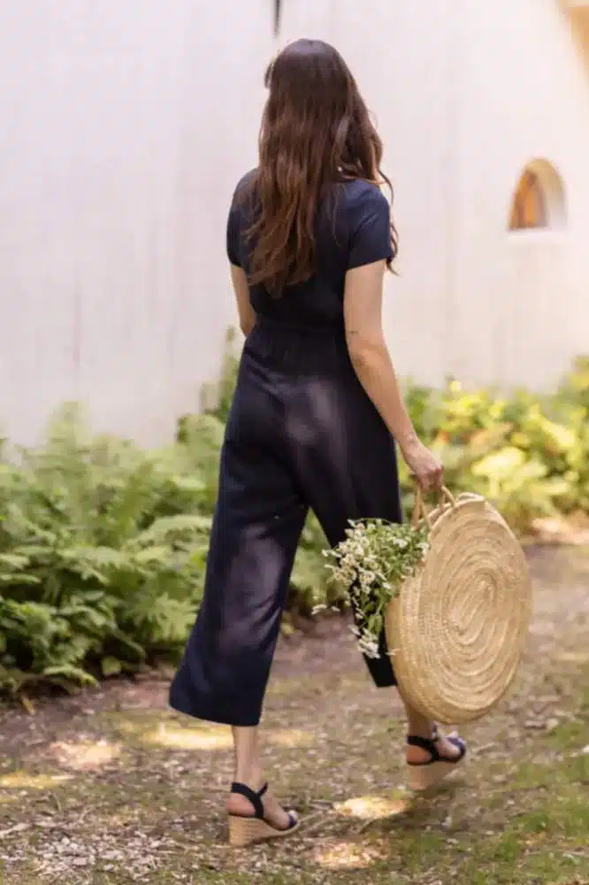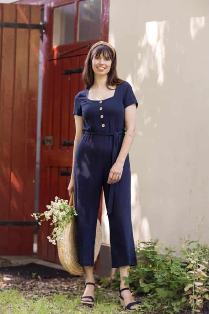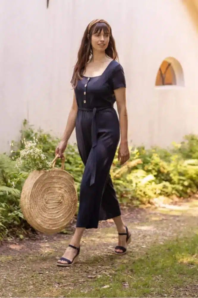 Gemaakt van een luxe linnen-mix, heeft deze jumpsuit een soepele valling en een verfijnde uitstraling. De diepe marineblauwe kleur voegt een tijdloze elegantie toe, terwijl de houten knopen een subtiel, natuurlijk detail bieden. Deze jumpsuit is ideaal voor zowel casual als formele gelegenheden: draag hem met sneakers voor een relaxte look of combineer hem met hakken voor een elegante uitstraling.