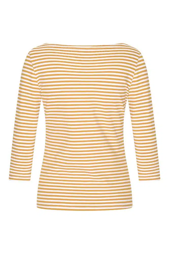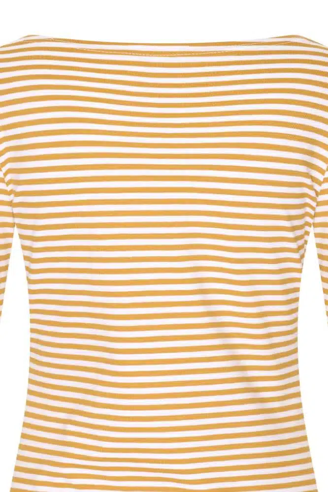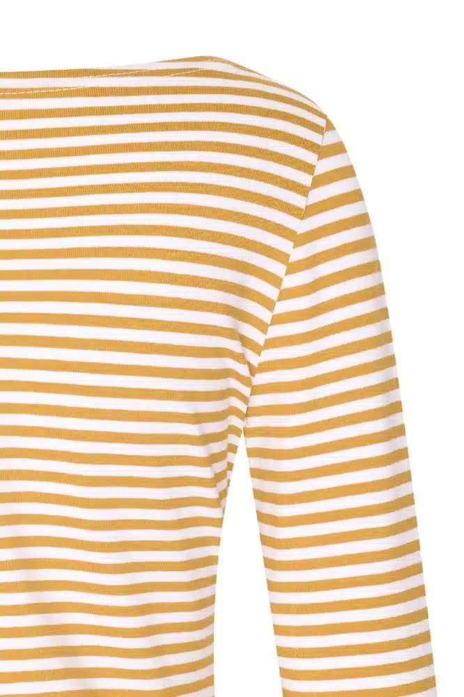 De Boatneck Top French Stripes Honey Yellow is gemaakt van 95% katoen en 5% elastaan, wat zorgt voor een zachte, ademende stof met een fijne stretch. Het katoen is van hoge kwaliteit, waardoor de top mooi in model blijft, ook na veelvuldig wassen.