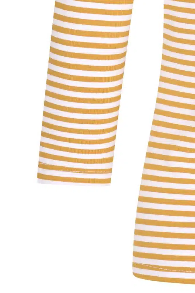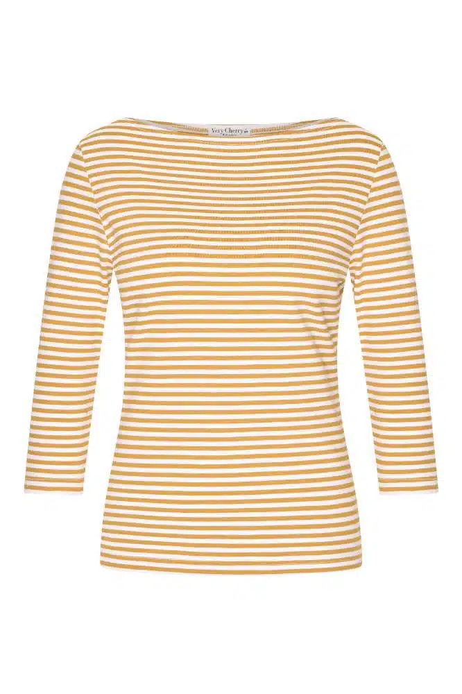 De Boatneck Top French Stripes Honey Yellow van Very Cherry is de perfecte basic met een vleugje Franse elegantie. Deze klassieke top heeft een tijdloze boothals en flatterende driekwartmouwen met een subtiel splitje aan de zijkant. De fijne ministreepjes geven het geheel een speelse, maar stijlvolle uitstraling. Dankzij de hoogwaardige katoenen tricot met elastaan sluit de top mooi aan en biedt hij ultiem draagcomfort.
