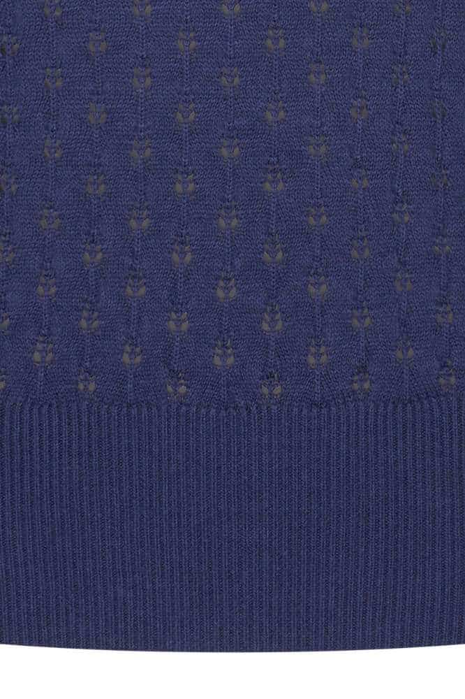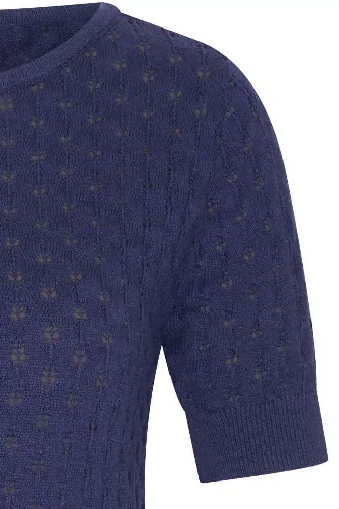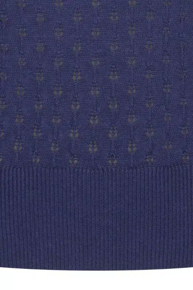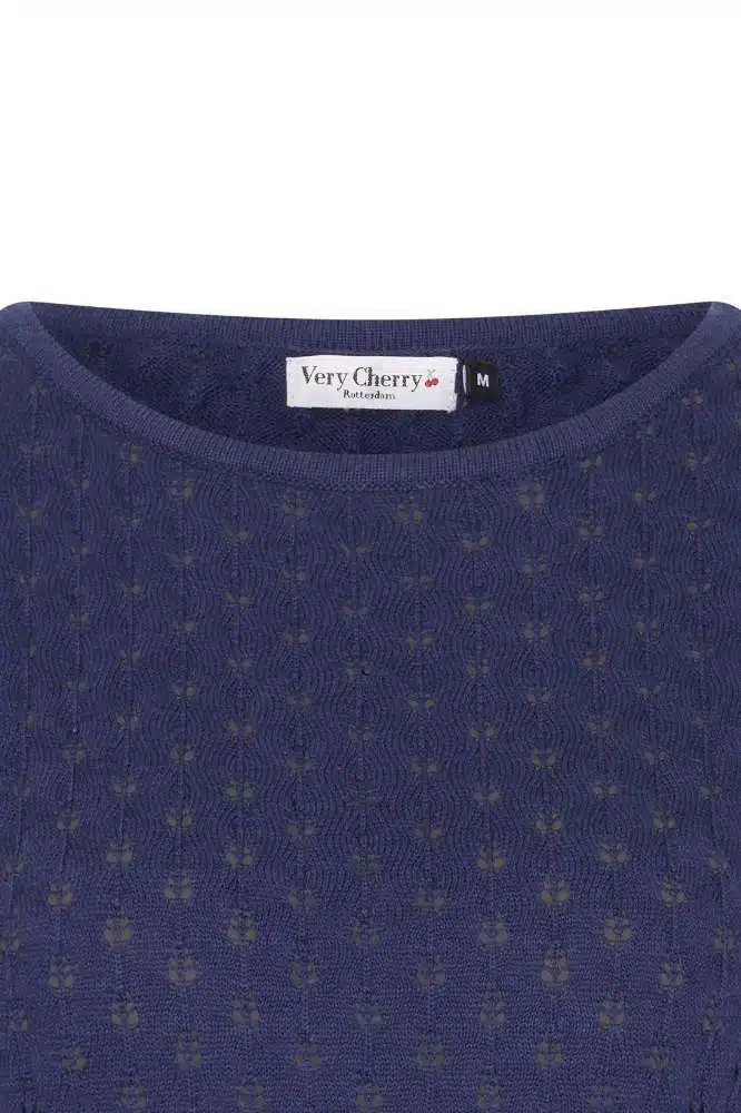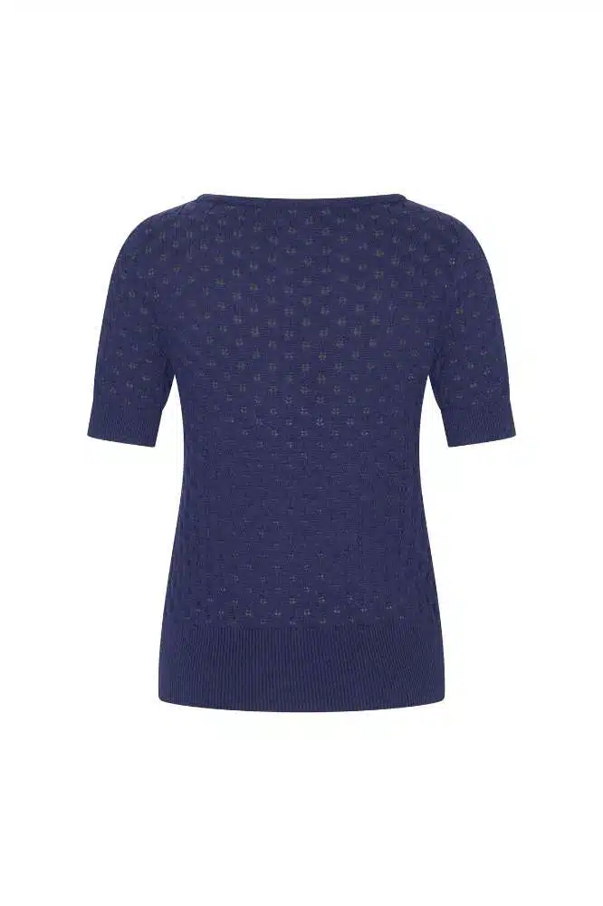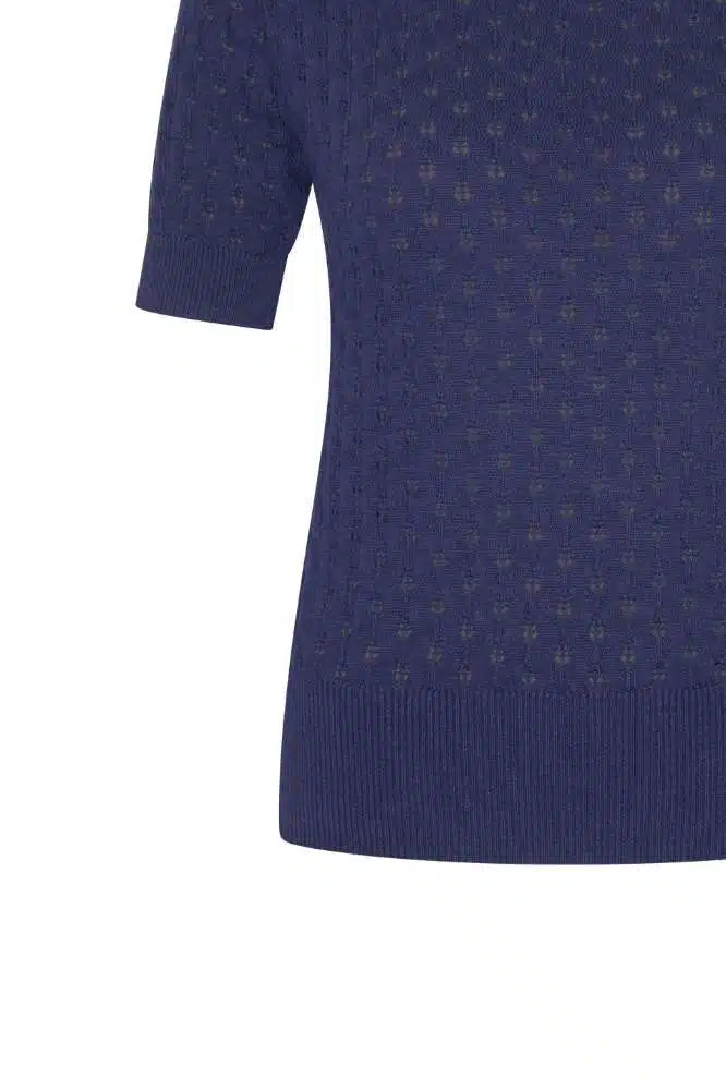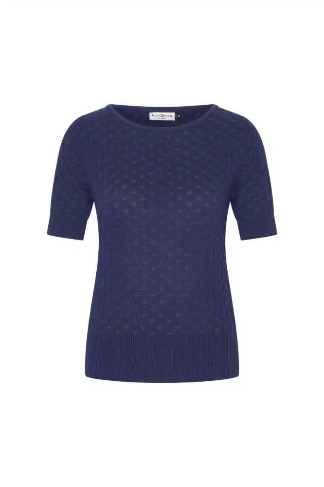 De Ella Top Marine van Very Cherry is een veelzijdig en elegant gebreid truitje dat niet mag ontbreken in je garderobe. Met zijn ronde hals, korte mouwen en subtiele ajourmotief straalt deze top tijdloze charme uit. De zachte mix van katoen en viscose zorgt voor een comfortabele pasvorm met lichte stretch, waardoor het truitje heerlijk aanvoelt op de huid en mooi in model blijft.