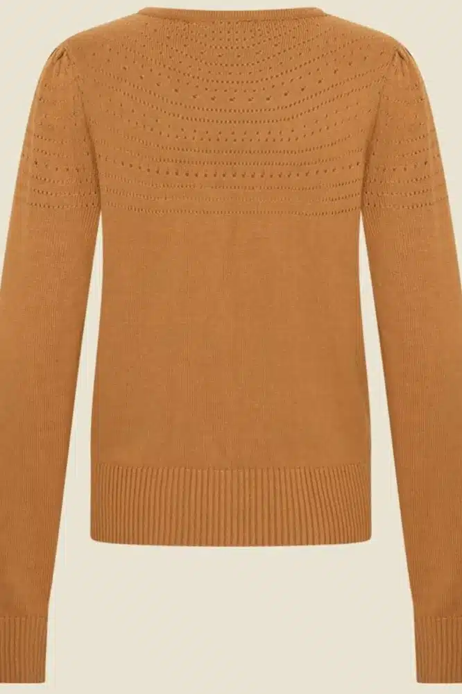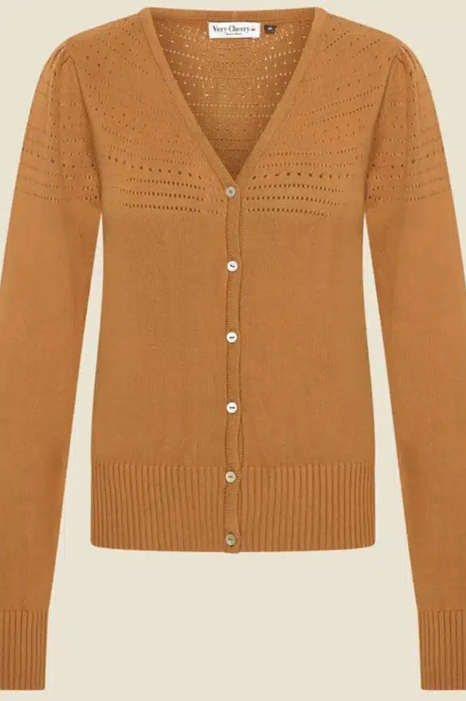 De Lucia V Neck Cardigan Cognac van Verry Cherry is een elegante en tijdloze toevoeging aan je garderobe. Dit vest combineert een vintage uitstraling met moderne duurzaamheid. De fijne details, zoals het subtiele ajourmotief en de licht gepofte mouwen, geven een charmante en verfijnde look. Dankzij de knoopsluiting en de aansluitende boorden kan je dit vest zowel open als gesloten dragen, waardoor het perfect is voor verschillende stijlen en gelegenheden.
