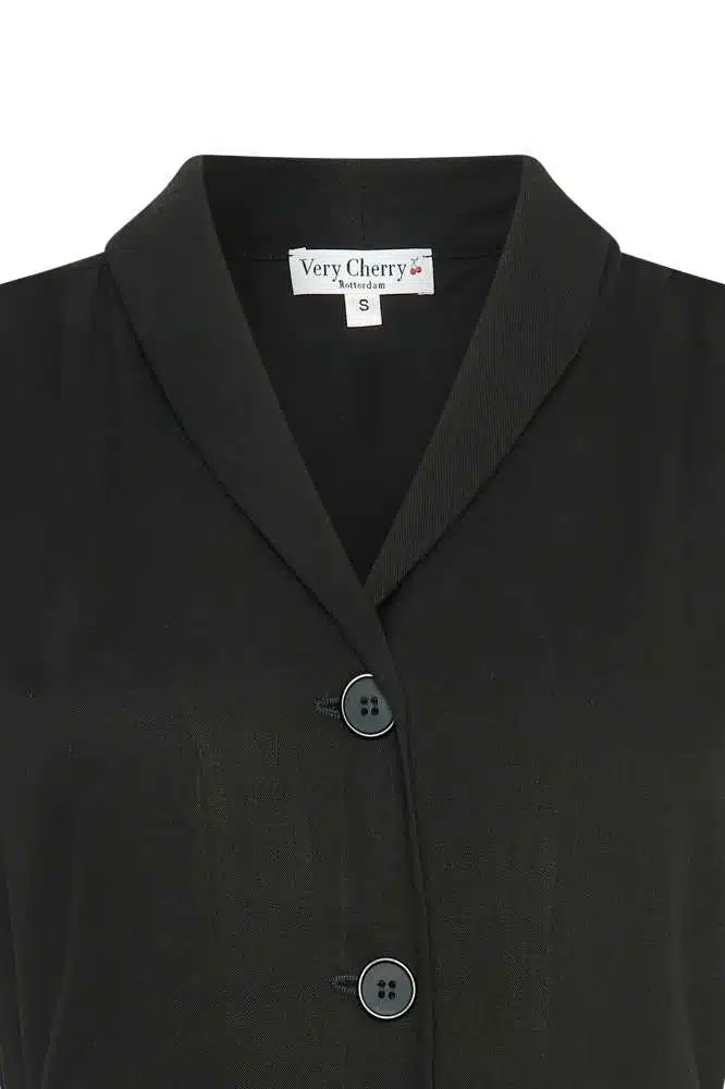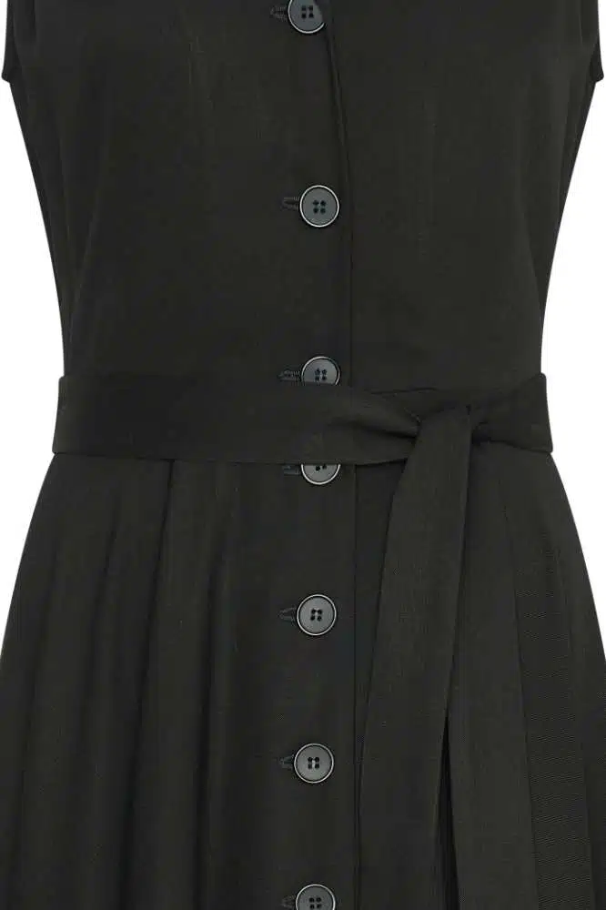 Het bijpassende strikceintuur in de taille geeft je de mogelijkheid om de pasvorm aan te passen en je figuur extra te accentueren. Door de knoopsluiting kan de jurk op verschillende manieren gestyled worden, bijvoorbeeld met een speelse open halslijn of juist volledig gesloten voor een klassieke look. Combineer de Nova Dress Olette Black met hakken en een clutch voor een feestelijke uitstraling, of draag haar met sneakers en een spijkerjack voor een meer casual, retro-geïnspireerde look.
