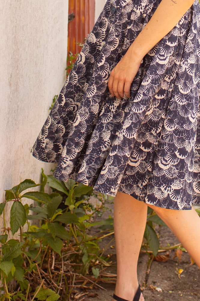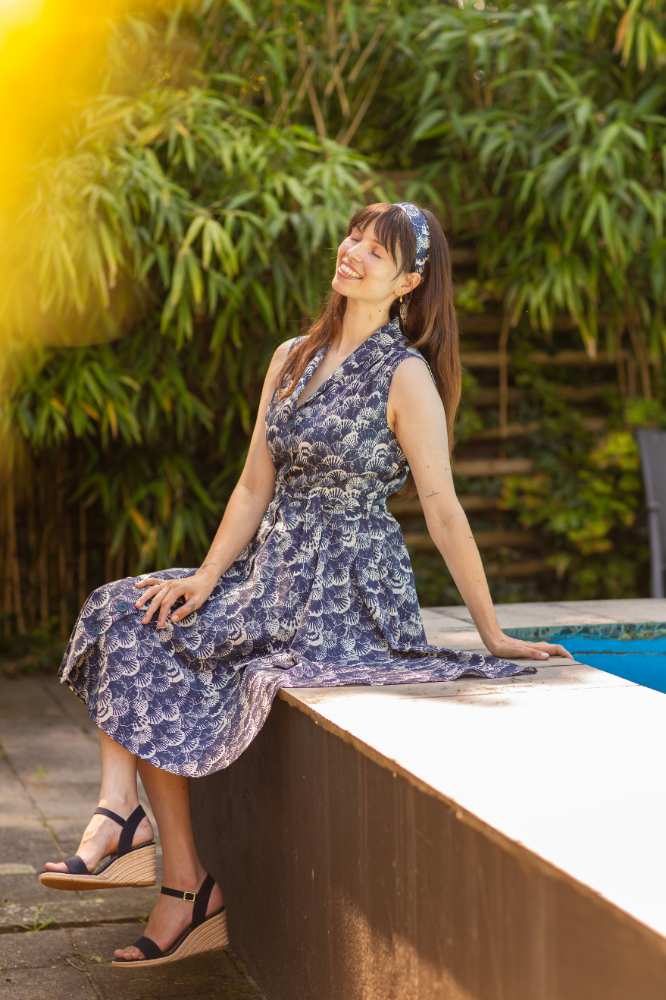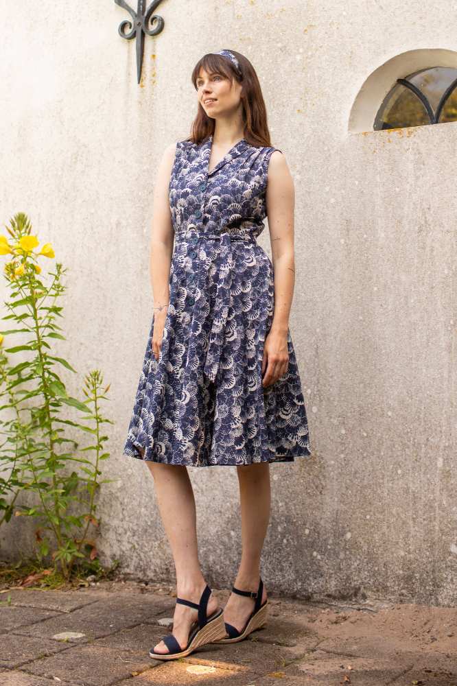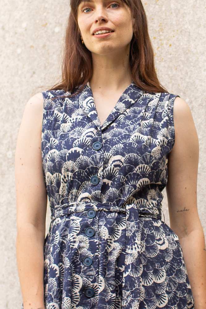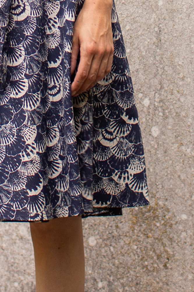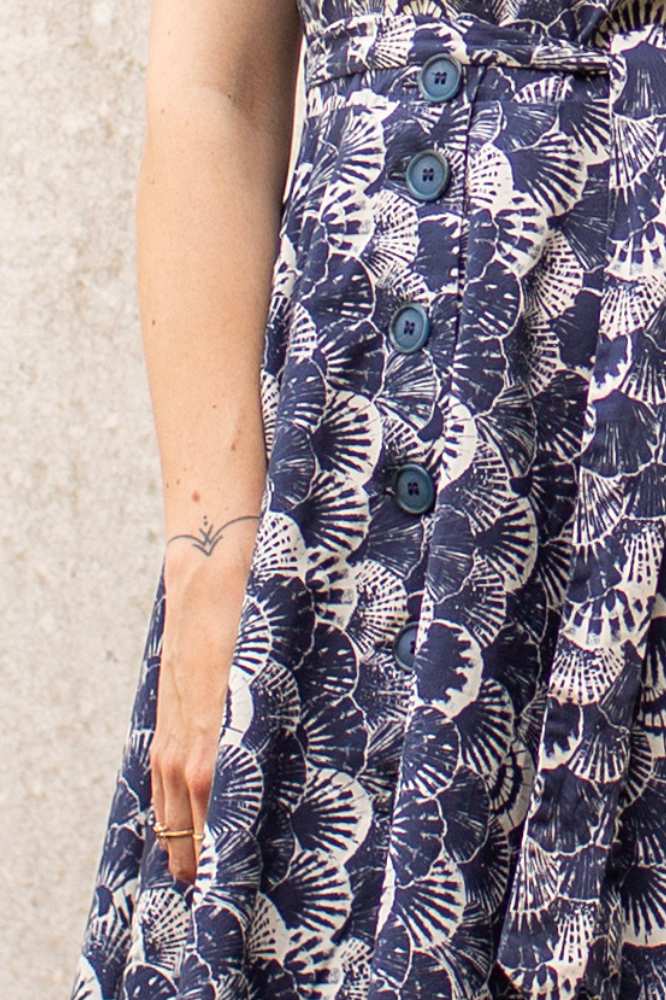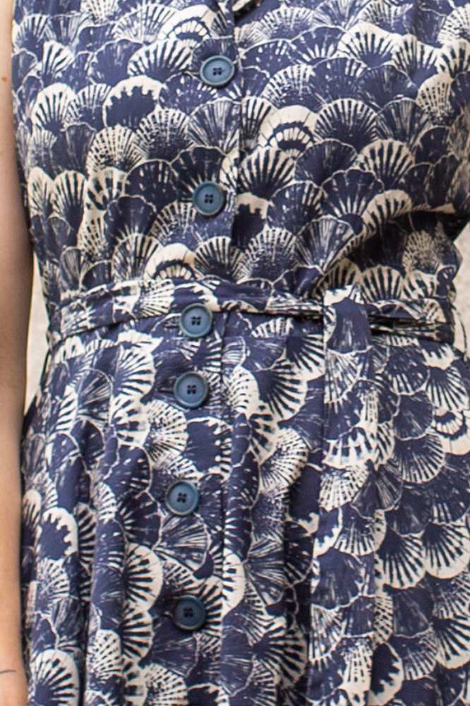 De stof, een hoogwaardige biologische katoen, voelt zacht aan op de huid en heeft een subtiele schelpenprint in marineblauw en ecru. Deze verfijnde print geeft de jurk een stijlvolle, maritieme uitstraling die perfect is voor zowel casual als geklede gelegenheden. Dankzij de driekwartmouwen en de klassieke knoopsluiting is de jurk veelzijdig en geschikt voor elk seizoen.