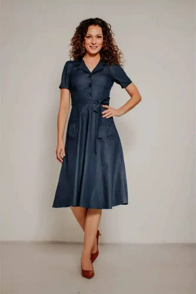 De jurk is uitgevoerd in Delfino Denim – een stevige maar soepele katoenen spijkerstof met een beetje stretch. Dit geeft de jurk niet alleen een stoere touch, maar ook het comfort om hem moeiteloos de hele dag te dragen. Twee opgestikte zakken en een bijpassend strikceintuur maken het ontwerp praktisch en veelzijdig.