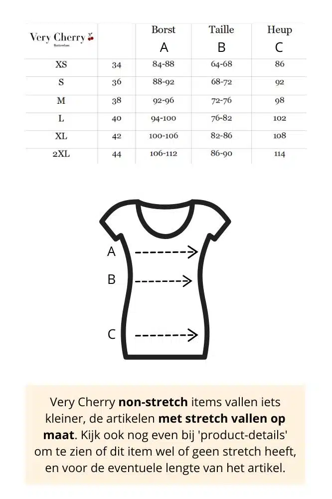 Very Cherry produceert haar kleding fairtrade in Europa, wat betekent dat de arbeidsomstandigheden eerlijk en verantwoord zijn. Door te kiezen voor deze jurk draag je bij aan een duurzame mode-industrie en investeer je in kleding die op een ethische manier is gemaakt. Bovendien zorgt de hoge kwaliteit van de stof ervoor dat de jurk lang meegaat en haar vorm en kleur behoudt, zelfs na meerdere wasbeurten.
