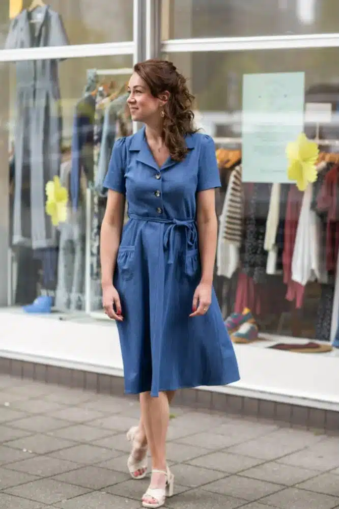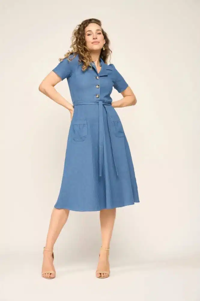 De reverskraag, korte mouwen en knoopsluiting aan de voorkant geven de jurk een klassieke uitstraling, terwijl de ritssluiting aan de zijkant zorgt voor een perfecte pasvorm. De twee opgestikte zakken en het bijpassende strikceintuur voegen een speels en praktisch element toe. Of je nu kiest voor een casual of formele look, deze jurk past zich moeiteloos aan jouw stijl aan.