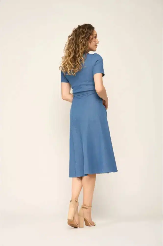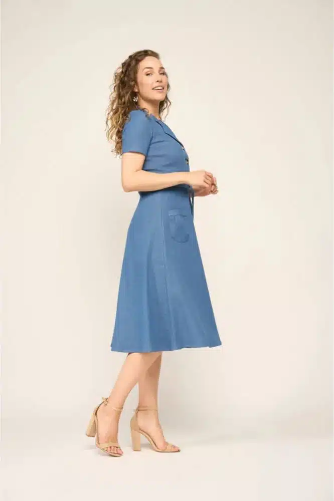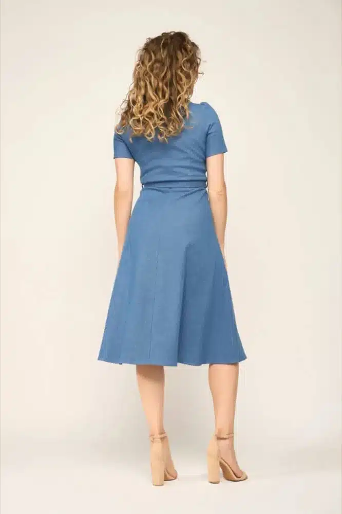 De Revers Dress Midi Light Denim Indigo van Very Cherry is een tijdloze en vrouwelijke jurk met een elegante snit. Het aangesloten lijfje en de wijd uitlopende A-lijn rok creëren een prachtig silhouet dat de taille accentueert. Dit maakt de jurk niet alleen stijlvol, maar ook uiterst comfortabel. Dankzij de mooie katoenen spijkerstof met stretch biedt deze jurk zowel elegantie als bewegingsvrijheid.
