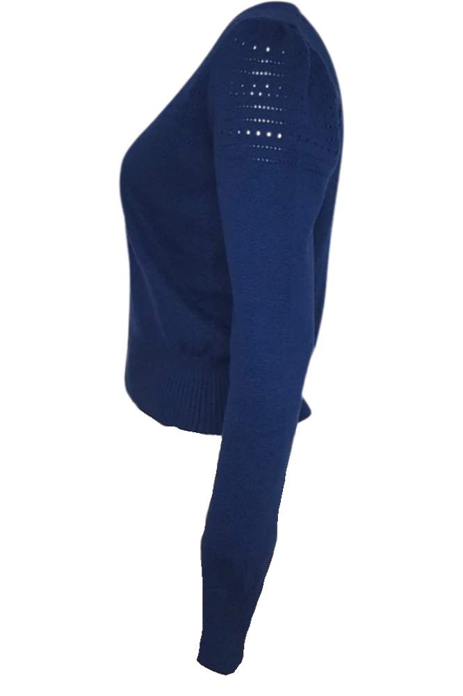 De Lucia V Neck Cardigan Marine van Verry Cherry is een elegante en tijdloze toevoeging aan je garderobe. Dit vest combineert een vintage uitstraling met moderne duurzaamheid. De fijne details, zoals het subtiele ajourmotief en de licht gepofte mouwen, geven een charmante en verfijnde look. Dankzij de knoopsluiting en de aansluitende boorden kan je dit vest zowel open als gesloten dragen, waardoor het perfect is voor verschillende stijlen en gelegenheden.