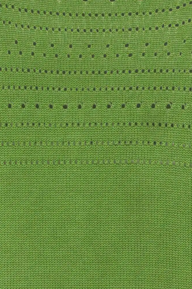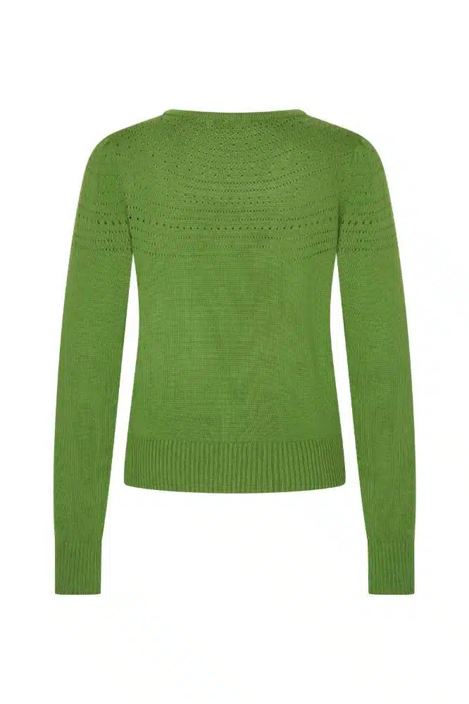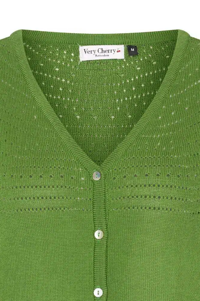 De Lucia V Neck Cardigan Olive Green van Verry Cherry is een elegante en tijdloze toevoeging aan je garderobe. Dit vest combineert een vintage uitstraling met moderne duurzaamheid. De fijne details, zoals het subtiele ajourmotief en de licht gepofte mouwen, geven een charmante en verfijnde look. Dankzij de knoopsluiting en de aansluitende boorden kan je dit vest zowel open als gesloten dragen, waardoor het perfect is voor verschillende stijlen en gelegenheden.