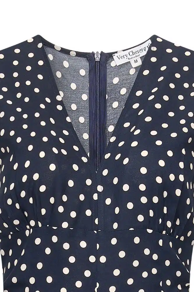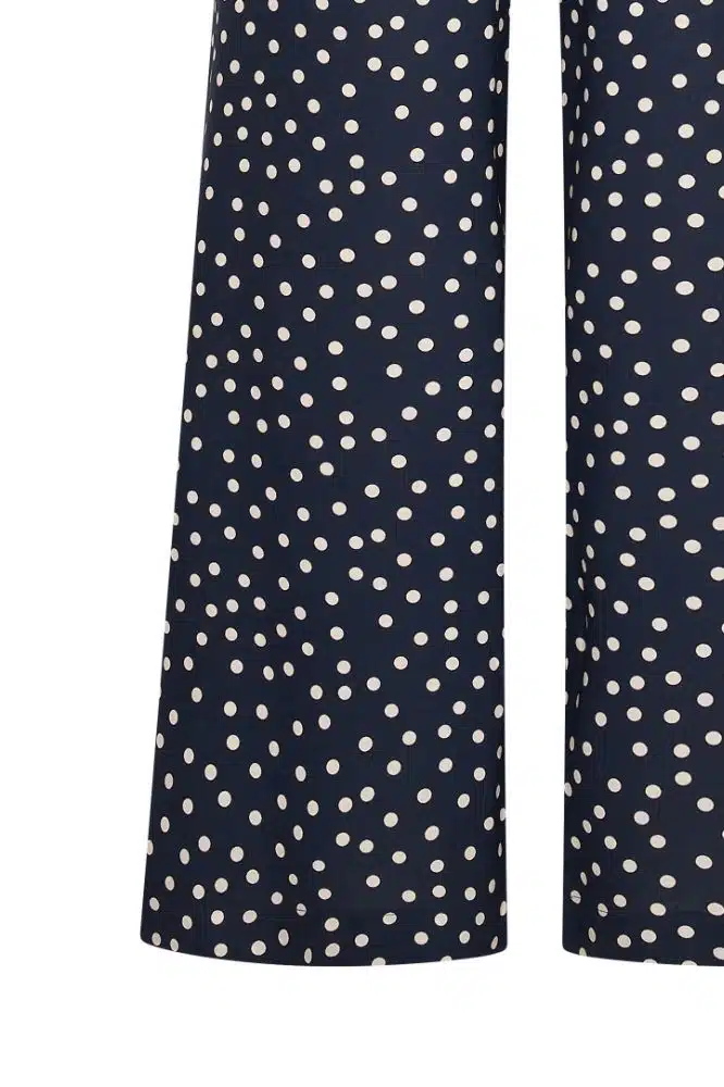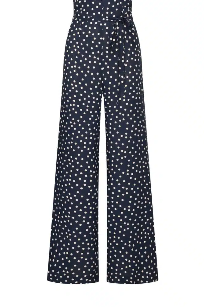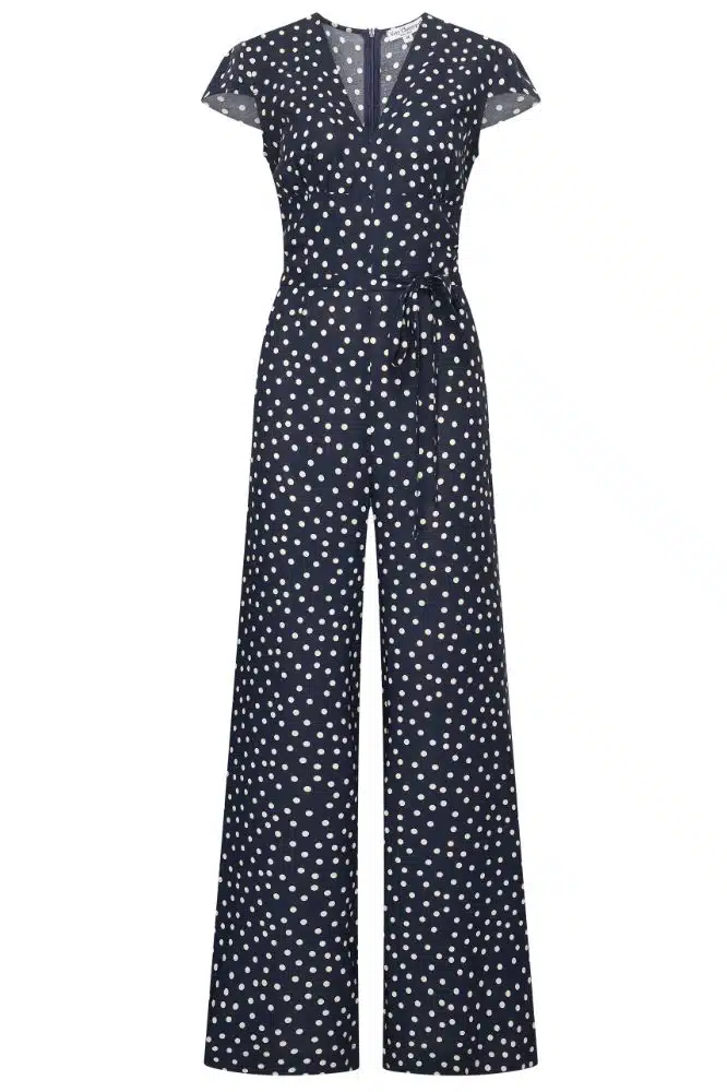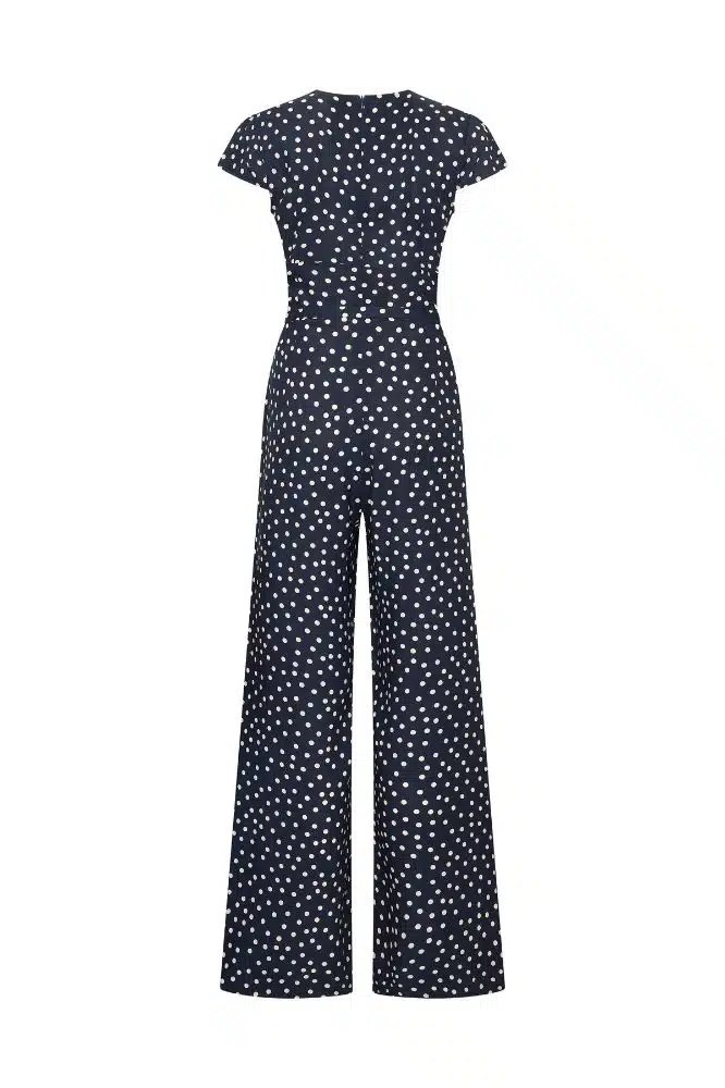 De Venice Jumpsuit Navy Dots van Very Cherry is de perfecte combinatie van elegantie en comfort. Met zijn flatterende V-hals, charmante plooitjes onder de borst en rechte, wijde pijpen straalt deze jumpsuit een tijdloze klasse uit. De subtiele navy-kleurige stof met speelse dots geeft een verfijnde, retro-uitstraling die moeiteloos kan worden gedragen voor zowel formele als casual gelegenheden.