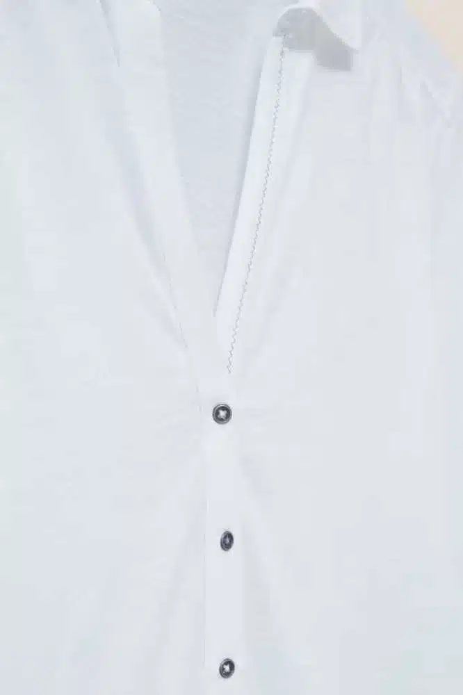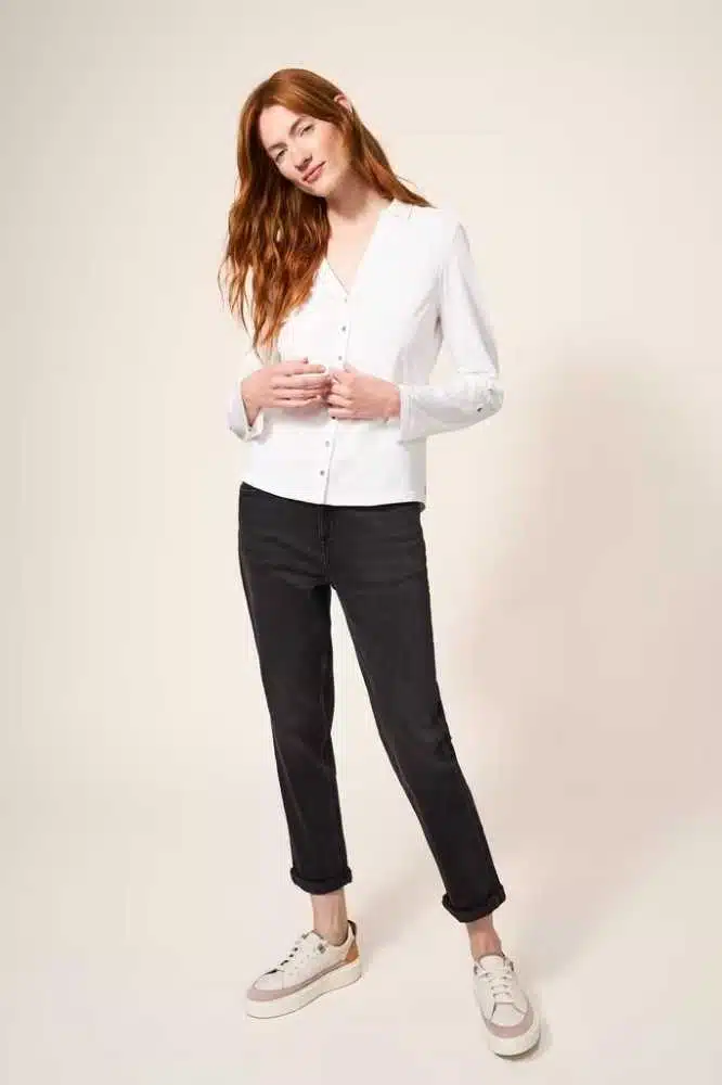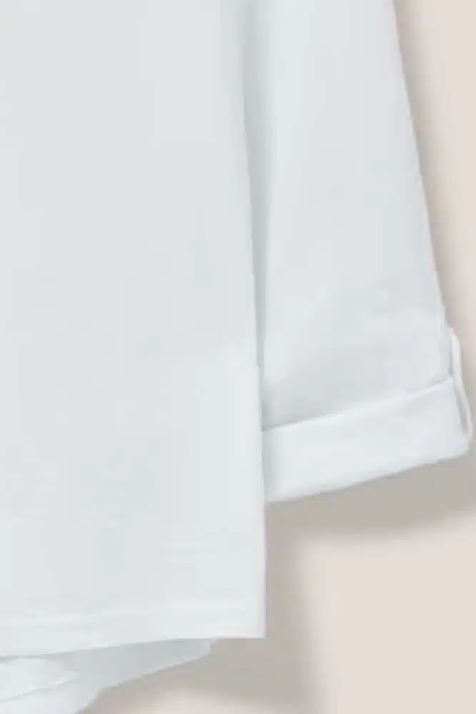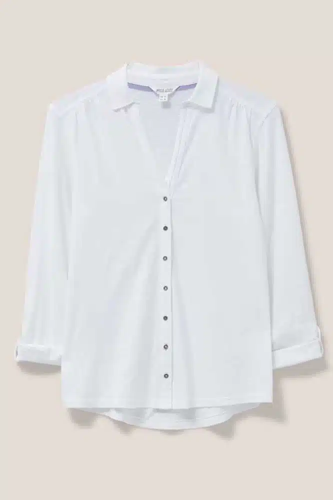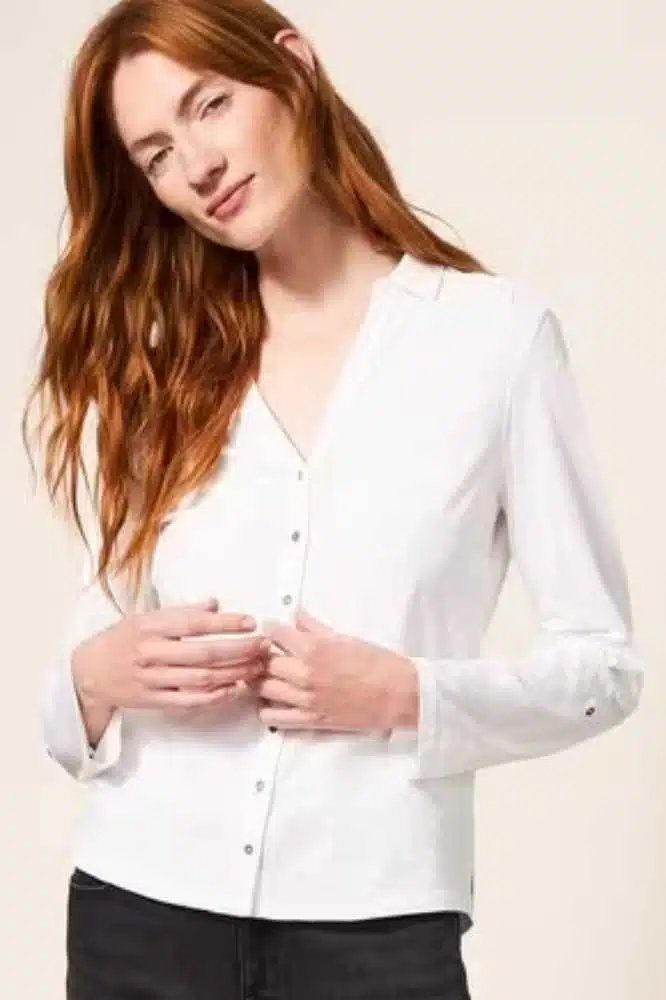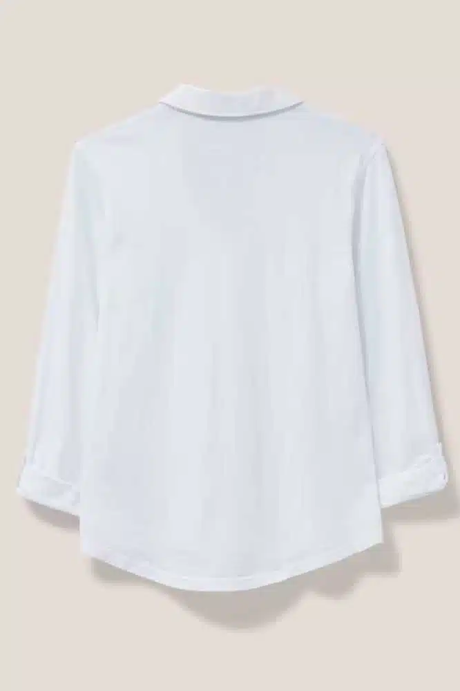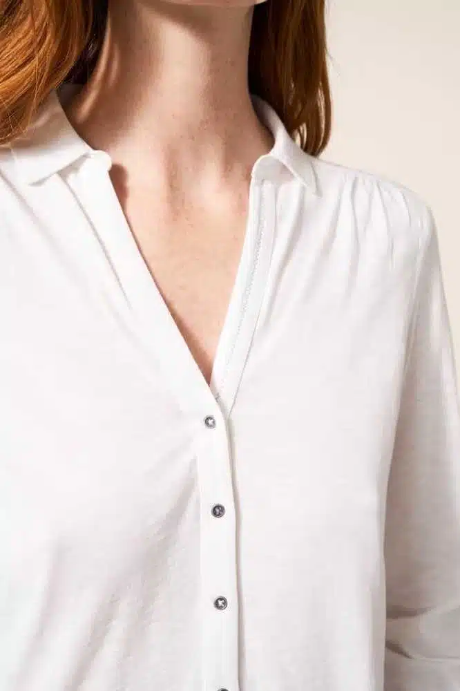 De Annie Jersey Shirt Brilliant White van White Stuff is een stijlvolle en comfortabele keuze voor elke dag. Met zijn zachte biologische katoen en trendy ontwerp biedt dit overhemd een perfecte balans tussen mode en comfort. Het ontwerp is voorzien van een kraag, lange mouwen die kunnen worden opgerold met een bandje en knoopje, en een regular fit voor een casual maar nette look. De blouse valt semi-aansluitend, en combineert perfect met je favoriete jeans, rok of pantalon. Voor een fijne Laagjes Look, combineer je de Annie Jersey shirt met één van White Stuff’s mooie truien.