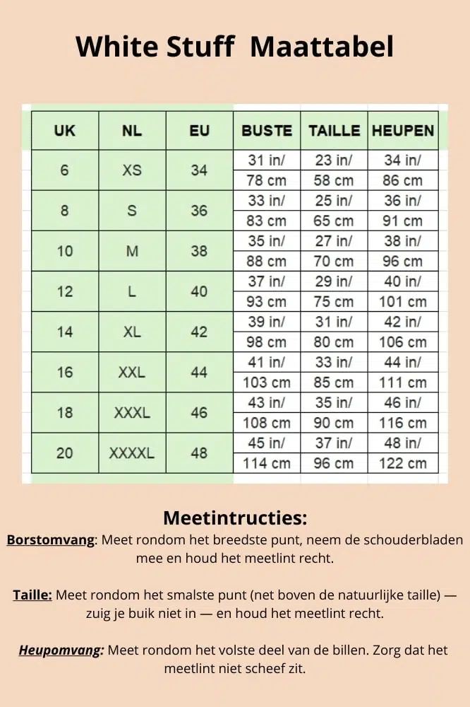 White Stuff staat bekend om comfortabele, draagbare kleding met oog voor materiaal en detail. Tijdloos, praktisch en ontworpen om seizoen na seizoen te blijven dragen.