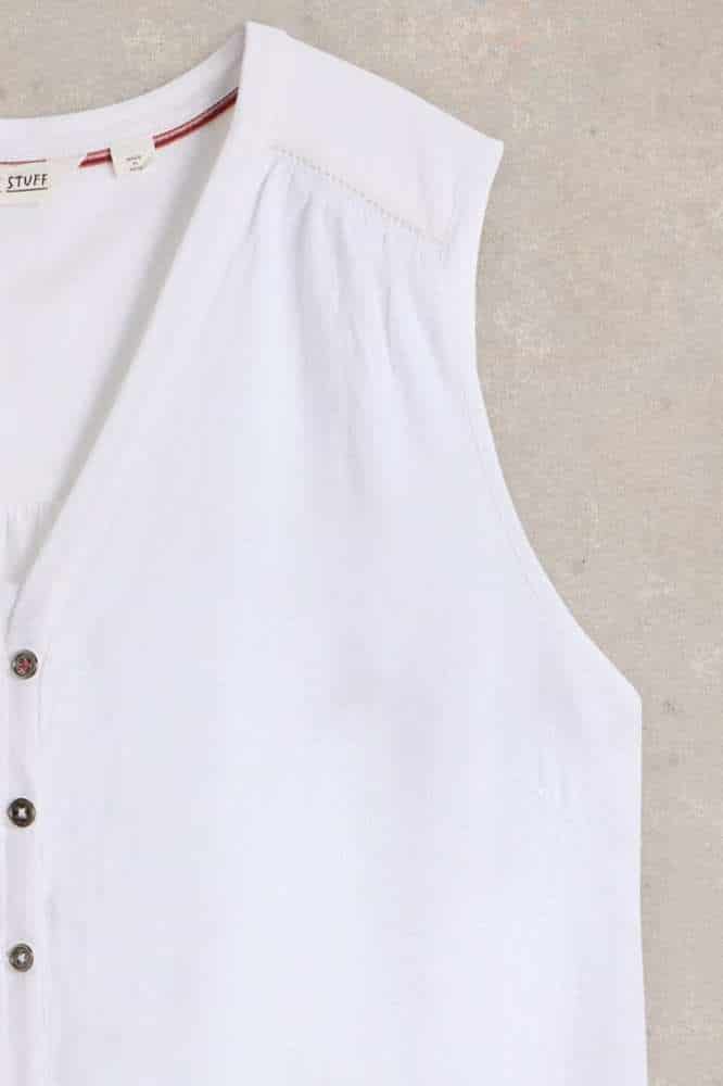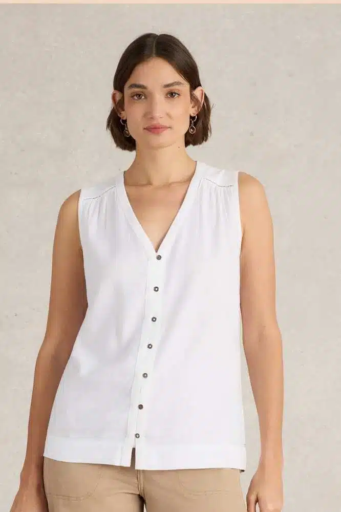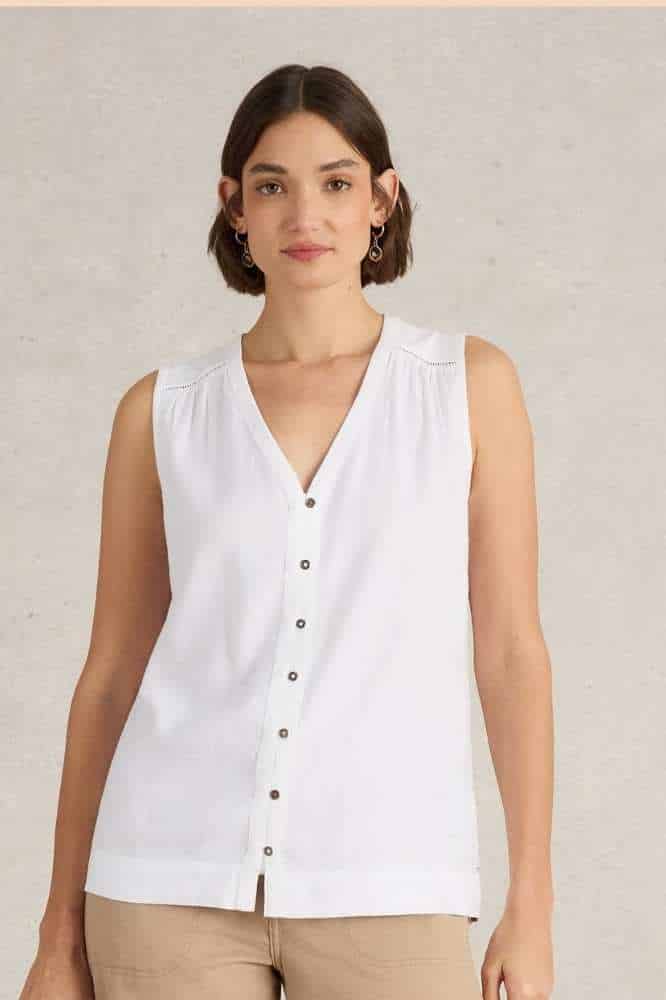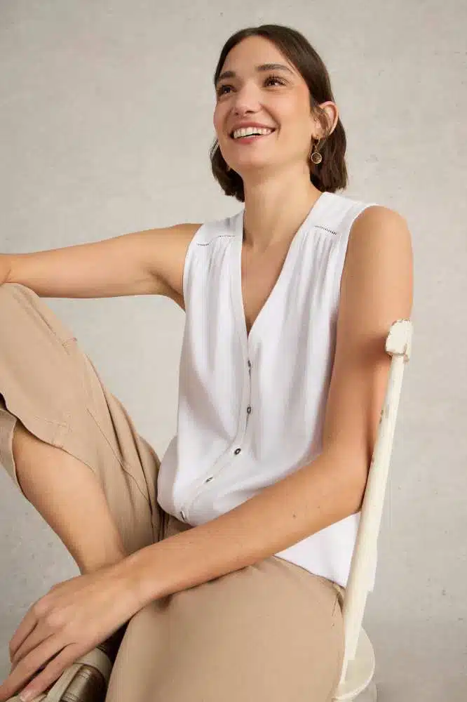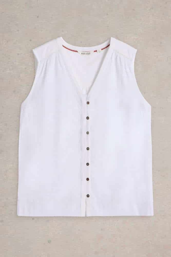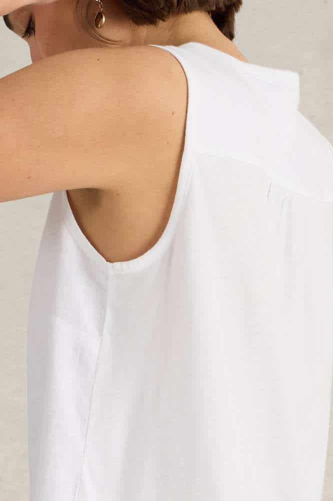 De Delilah Button Top Brilliant White van White Stuff is een tijdloze essential die in geen enkele garderobe mag ontbreken. Deze mouwloze top is ontworpen voor moeiteloos comfort en stijlvolle veelzijdigheid. Dankzij de lichte, ademende linnenmix voelt de stof heerlijk zacht aan op de huid en biedt hij een natuurlijke, luchtige pasvorm. Ideaal voor warme dagen of als subtiele laag onder een blazer of vest.