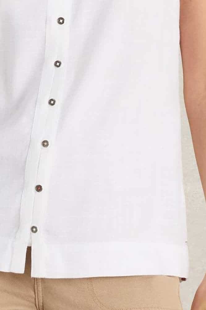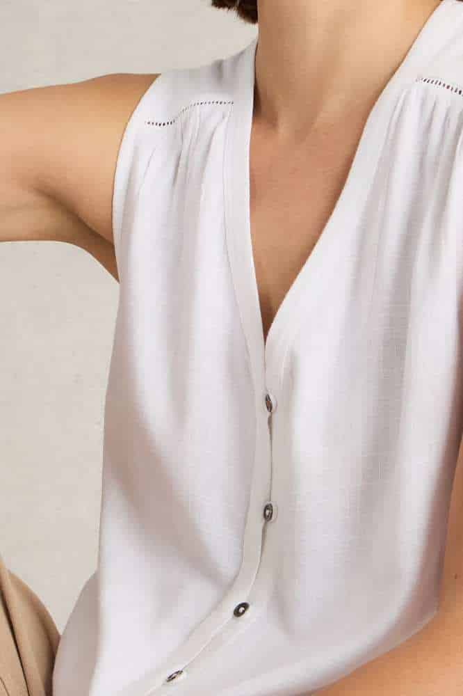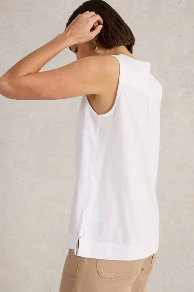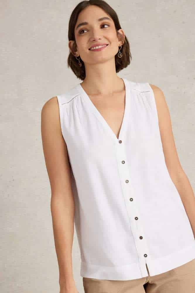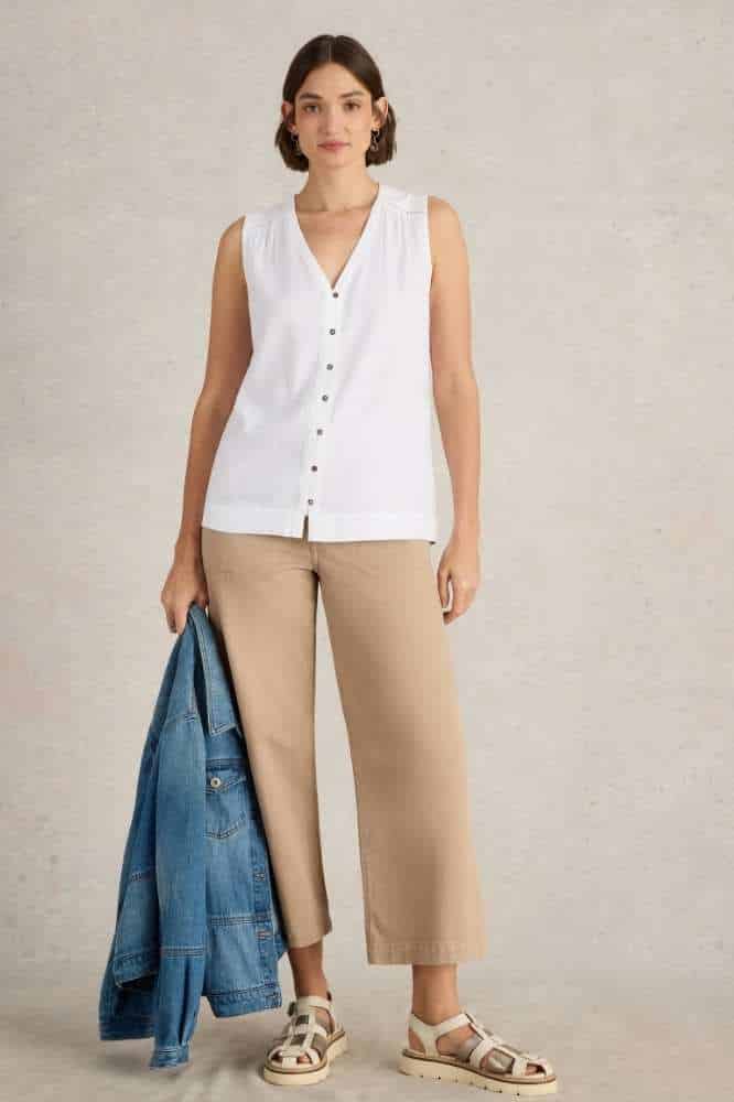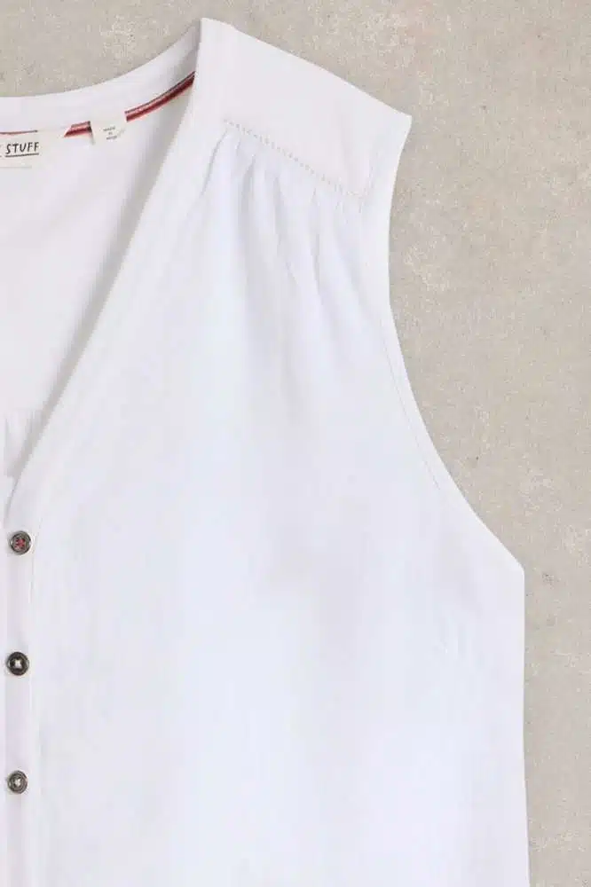 De Delilah Button Top Brilliant White van White Stuff is een tijdloze essential die in geen enkele garderobe mag ontbreken. Deze mouwloze top is ontworpen voor moeiteloos comfort en stijlvolle veelzijdigheid. Dankzij de lichte, ademende linnenmix voelt de stof heerlijk zacht aan op de huid en biedt hij een natuurlijke, luchtige pasvorm. Ideaal voor warme dagen of als subtiele laag onder een blazer of vest.