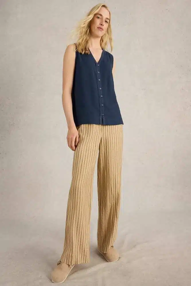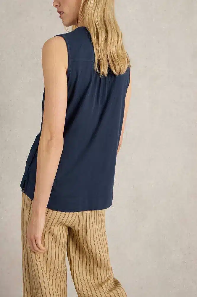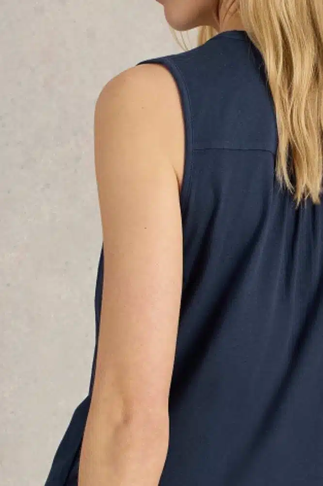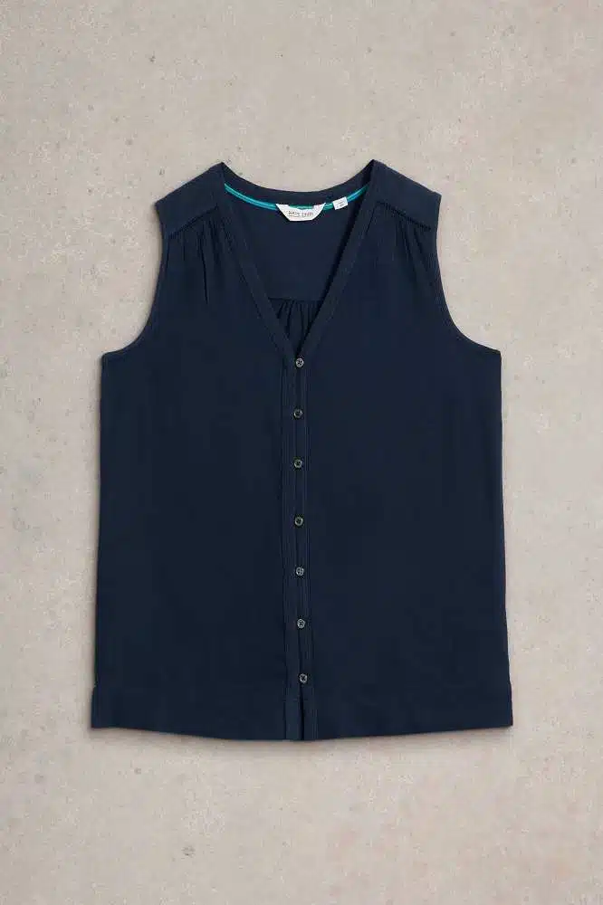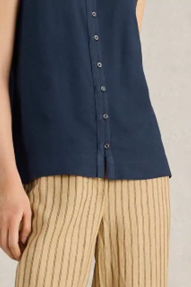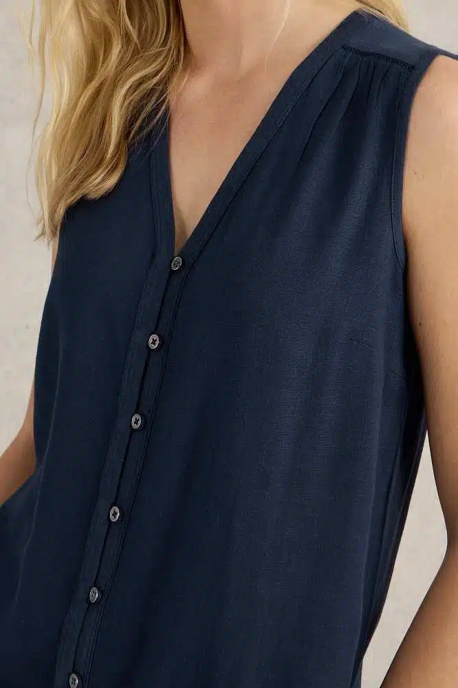 De Delilah Button Top Dark Navy van White Stuff is een tijdloze essential die in geen enkele garderobe mag ontbreken. Deze mouwloze top is ontworpen voor moeiteloos comfort en stijlvolle veelzijdigheid. Dankzij de lichte, ademende linnenmix voelt de stof heerlijk zacht aan op de huid en biedt hij een natuurlijke, luchtige pasvorm. Ideaal voor warme dagen of als subtiele laag onder een blazer of vest.
