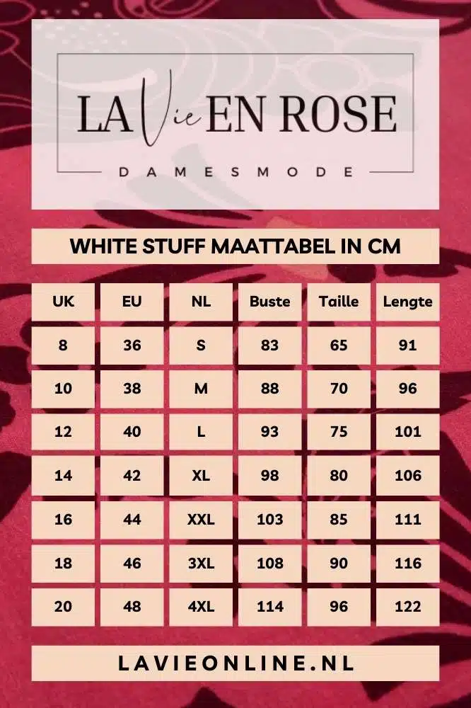 White Stuff is een gerenommeerd Brits merk dat bekendstaat om zijn toewijding aan kwaliteit, duurzaamheid en tijdloze stijl. Met een focus op ethische productie en het gebruik van milieuvriendelijke materialen, streeft White Stuff ernaar kleding te creëren die niet alleen modieus is, maar ook verantwoord. Hun collecties weerspiegelen een perfecte balans tussen comfort en elegantie, ontworpen voor de moderne vrouw die bewust kiest voor zowel stijl als duurzaamheid. Door te kiezen voor White Stuff, investeer je in kleding die met zorg en aandacht is gemaakt, met respect voor zowel de drager als de planeet.