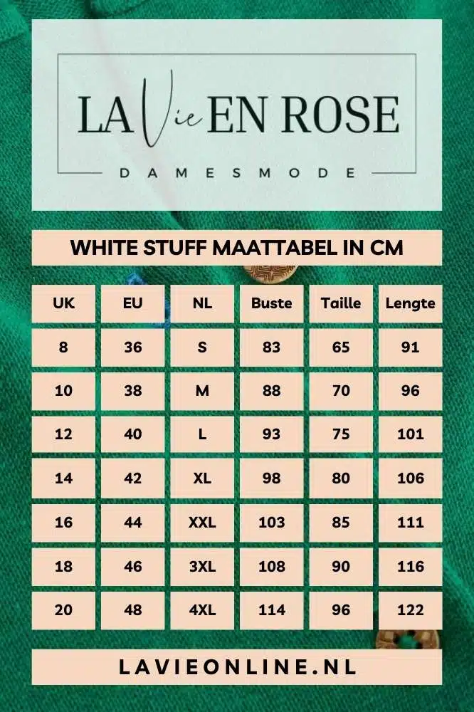 White Stuff is een geliefd Brits merk dat bekend staat om zijn tijdloze en veelzijdige kleding voor vrouwen. Het merk combineert comfort en stijl op een unieke manier, waardoor elke collectie aansluit bij de behoeften en smaak van moderne vrouwen. Met een sterke toewijding aan duurzaamheid en ethische productie, is White Stuff een merk dat niet alleen mooie kleding maakt, maar ook bijdraagt aan een betere wereld.
