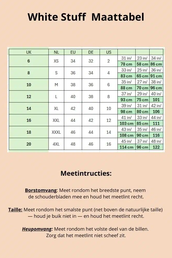 White Stuff is een geliefd Brits merk dat bekend staat om zijn tijdloze en veelzijdige kleding voor vrouwen. Het merk combineert comfort en stijl op een unieke manier, waardoor elke collectie aansluit bij de behoeften en smaak van moderne vrouwen. Met een sterke toewijding aan duurzaamheid en ethische productie, is White Stuff een merk dat niet alleen mooie kleding maakt, maar ook bijdraagt aan een betere wereld.
