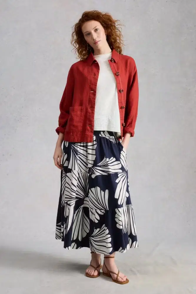 Combineer de Marissa Jersey Maxi Skirt met de White Stuff Nova Linen Blend Cardi Dark Pink en de White Stuff Ginni Linen Polo Tee Natural White. De zachte tinten van het vest en de top brengen rust in de outfit, terwijl de rok zorgt voor een speels en levendig contrast.