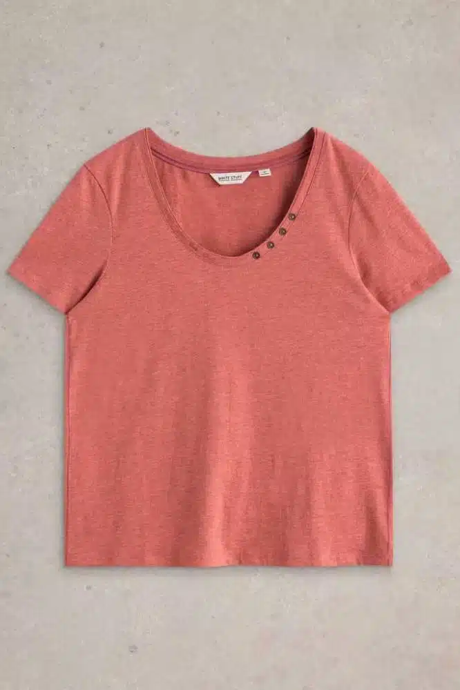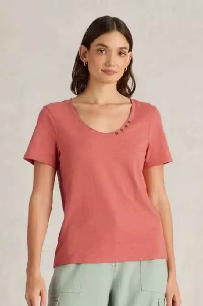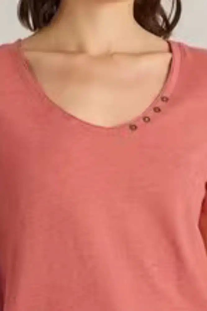 De Nadia Short Sleeve Tee Mid Coral is een veelzijdig en comfortabel T-shirt dat niet in je garderobe mag ontbreken. Dit Fairtrade katoenen shirt heeft een subtiel vrouwelijk ontwerp met een elegante scoop neckline en charmante knoopdetails op de schouder. De zachte, ademende stof voelt heerlijk aan op de huid en biedt een fijne pasvorm voor dagelijks gebruik.