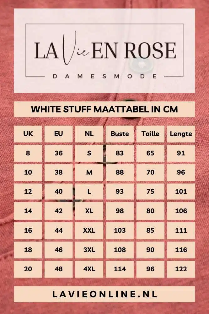 White Stuff is een Brits merk dat zich richt op hoogwaardige, duurzame mode met een tijdloze uitstraling. Het merk zet zich in voor eerlijke productie en milieuvriendelijke materialen, zonder in te leveren op stijl en comfort. Elk kledingstuk wordt met zorg ontworpen om lang mee te gaan en met liefde gedragen te worden.