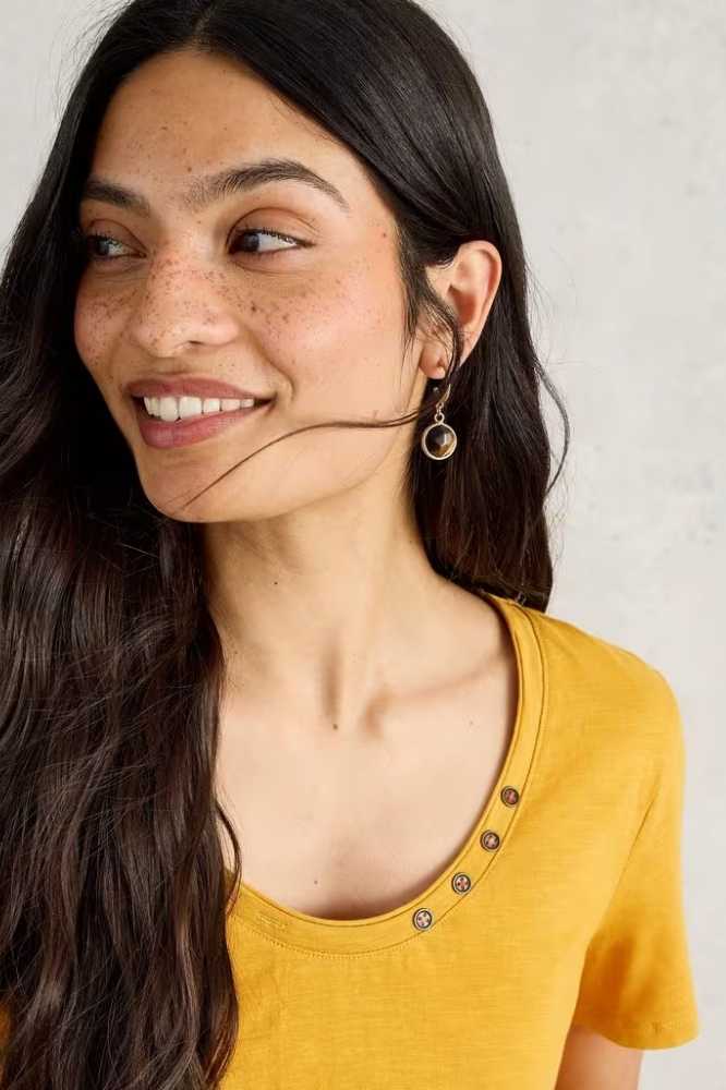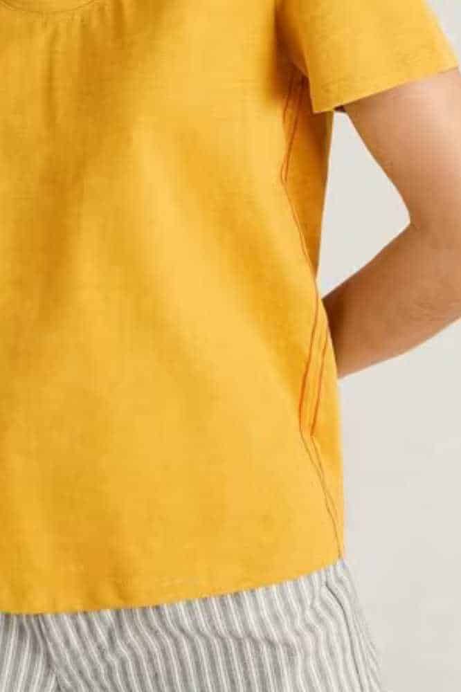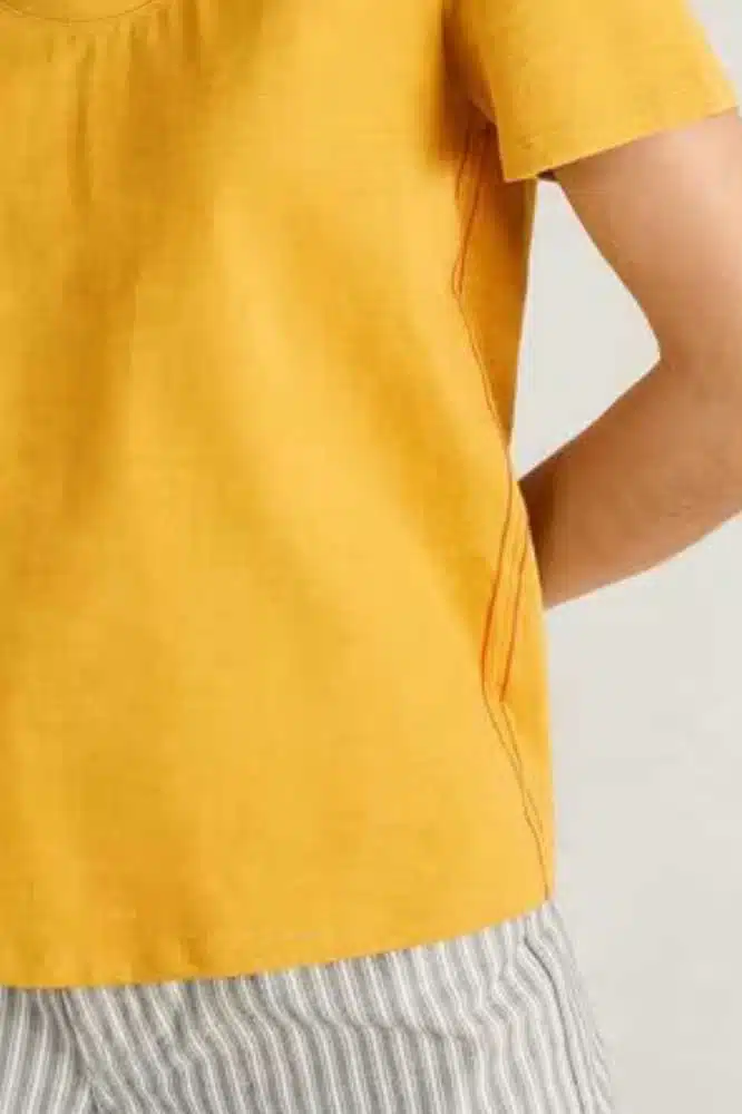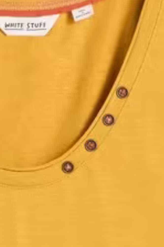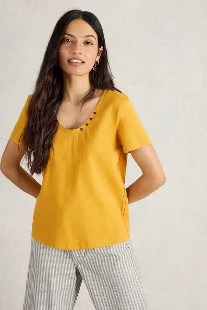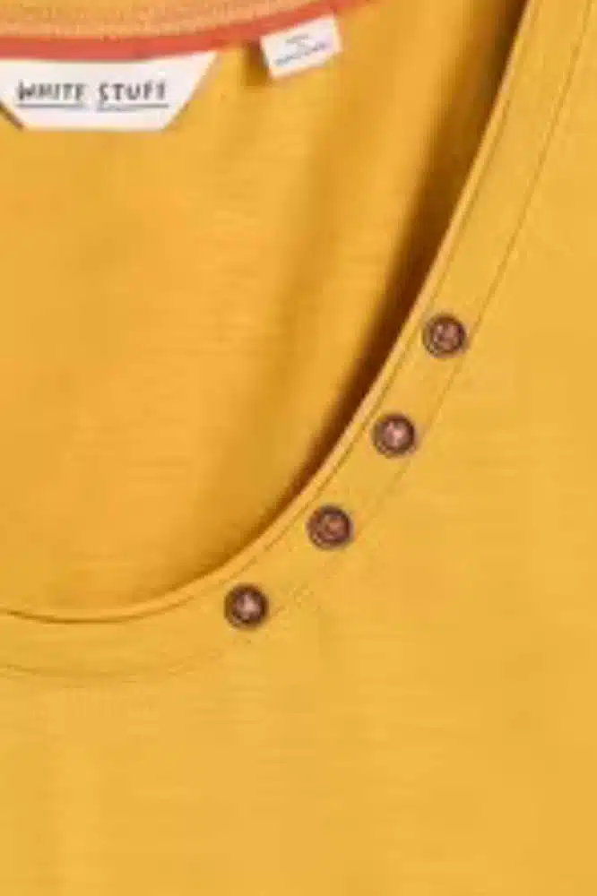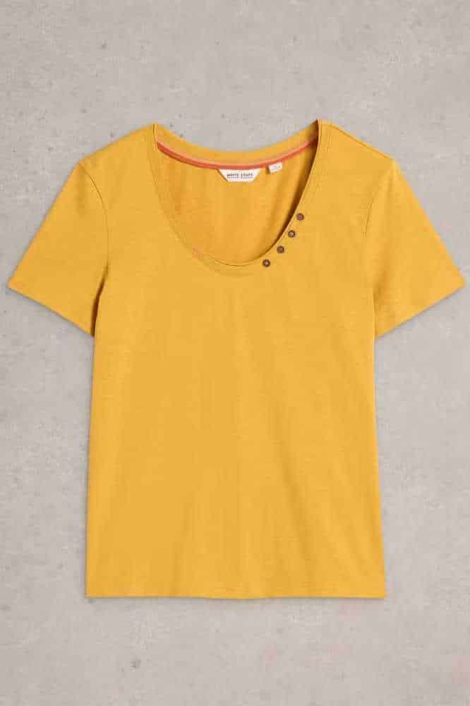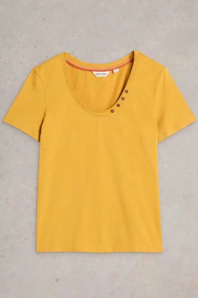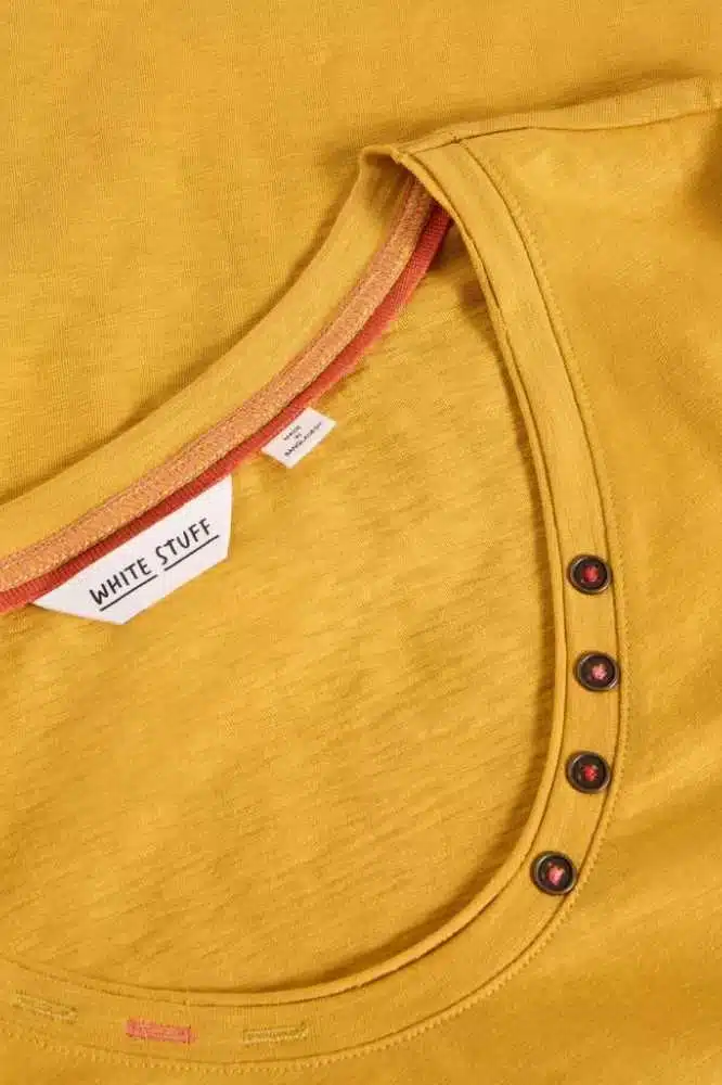 De Nadia Short Sleeve Tee Mid Yellow is een veelzijdig en comfortabel T-shirt dat niet in je garderobe mag ontbreken. Dit Fairtrade katoenen shirt heeft een subtiel vrouwelijk ontwerp met een elegante scoop neckline en charmante knoopdetails op de schouder. De zachte, ademende stof voelt heerlijk aan op de huid en biedt een fijne pasvorm voor dagelijks gebruik.