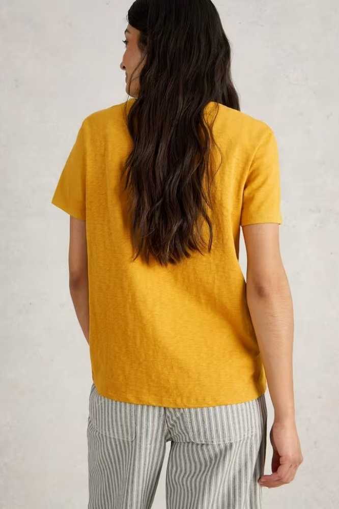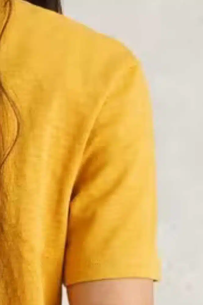 De warme Mid Yellow tint geeft je outfit een frisse en zomerse uitstraling, perfect om te combineren met zowel neutrale als gedurfde kleuren. Draag dit T-shirt met een jeans voor een casual look of onder een blazer voor een meer geklede uitstraling.