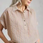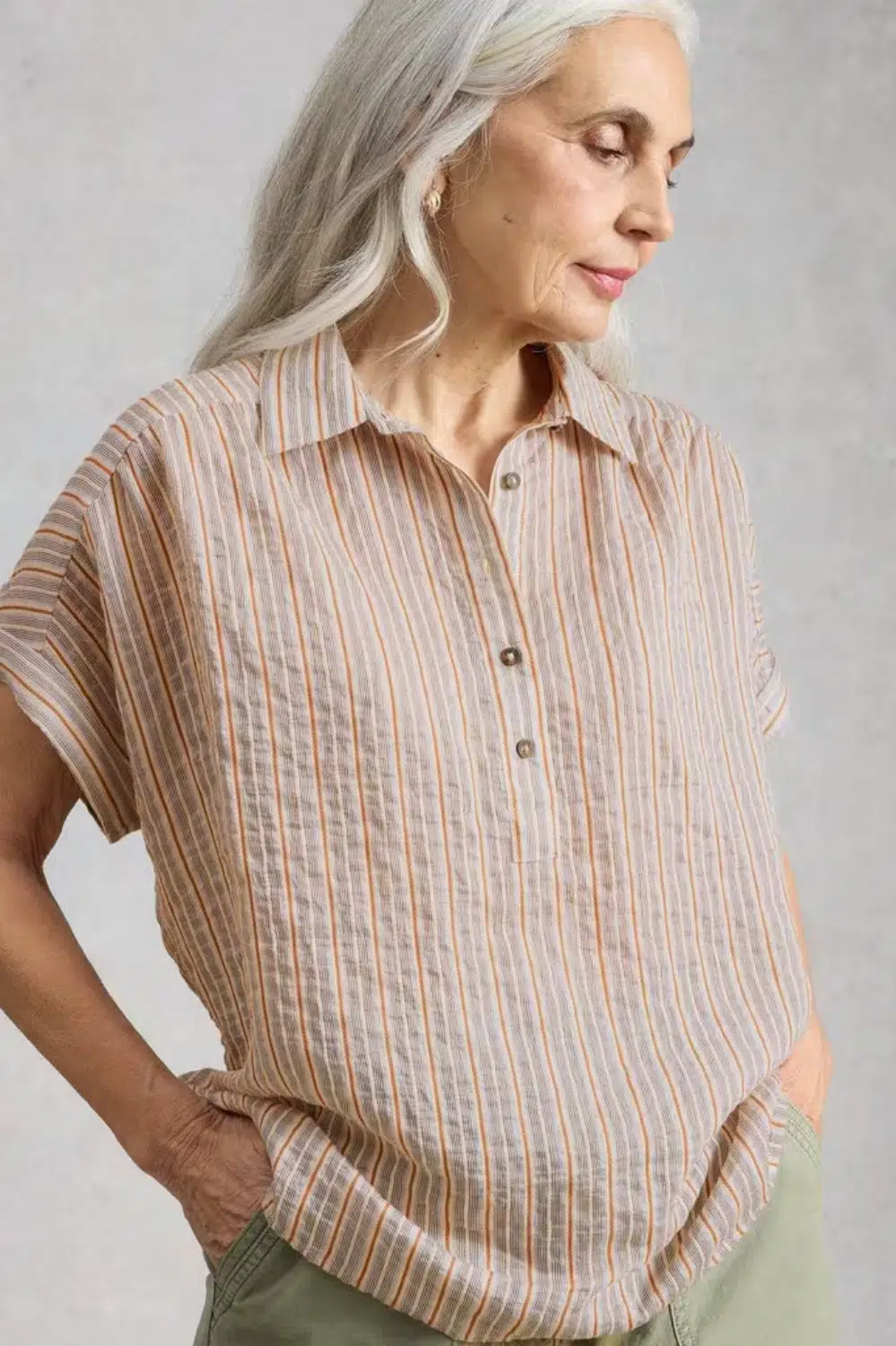 De Orla Pop Over Shirt heeft precies die ontspannen uitstraling waar je automatisch naar grijpt zodra het warmer wordt. De zachte, iets vervaagde streepprint geeft de blouse een nonchalante, zomerse look — alsof je al onderweg bent naar zon en terras.